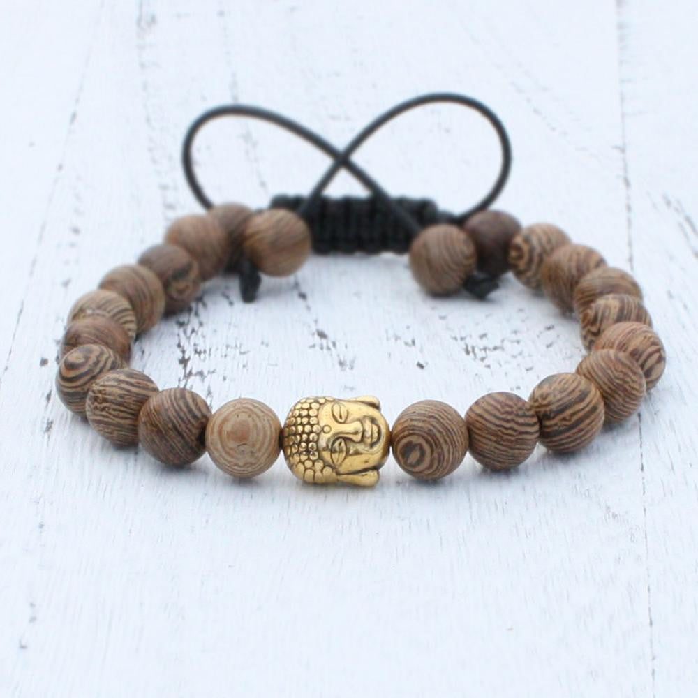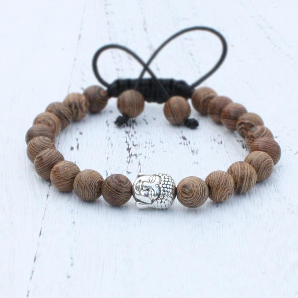 8mm Natural Wood Beads Adjustable Bracelet With Antique Buddha Head Charm