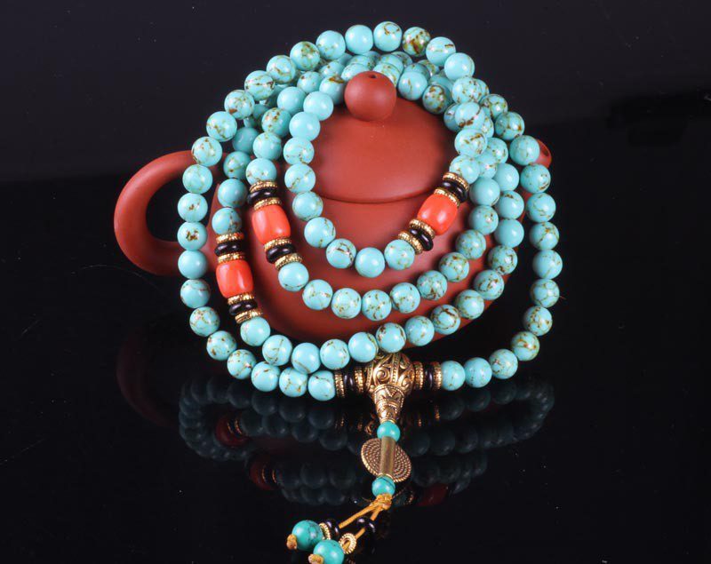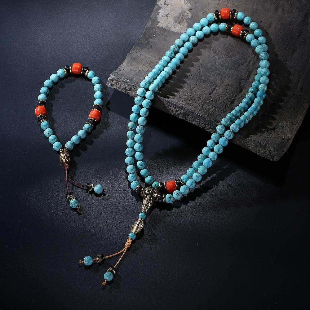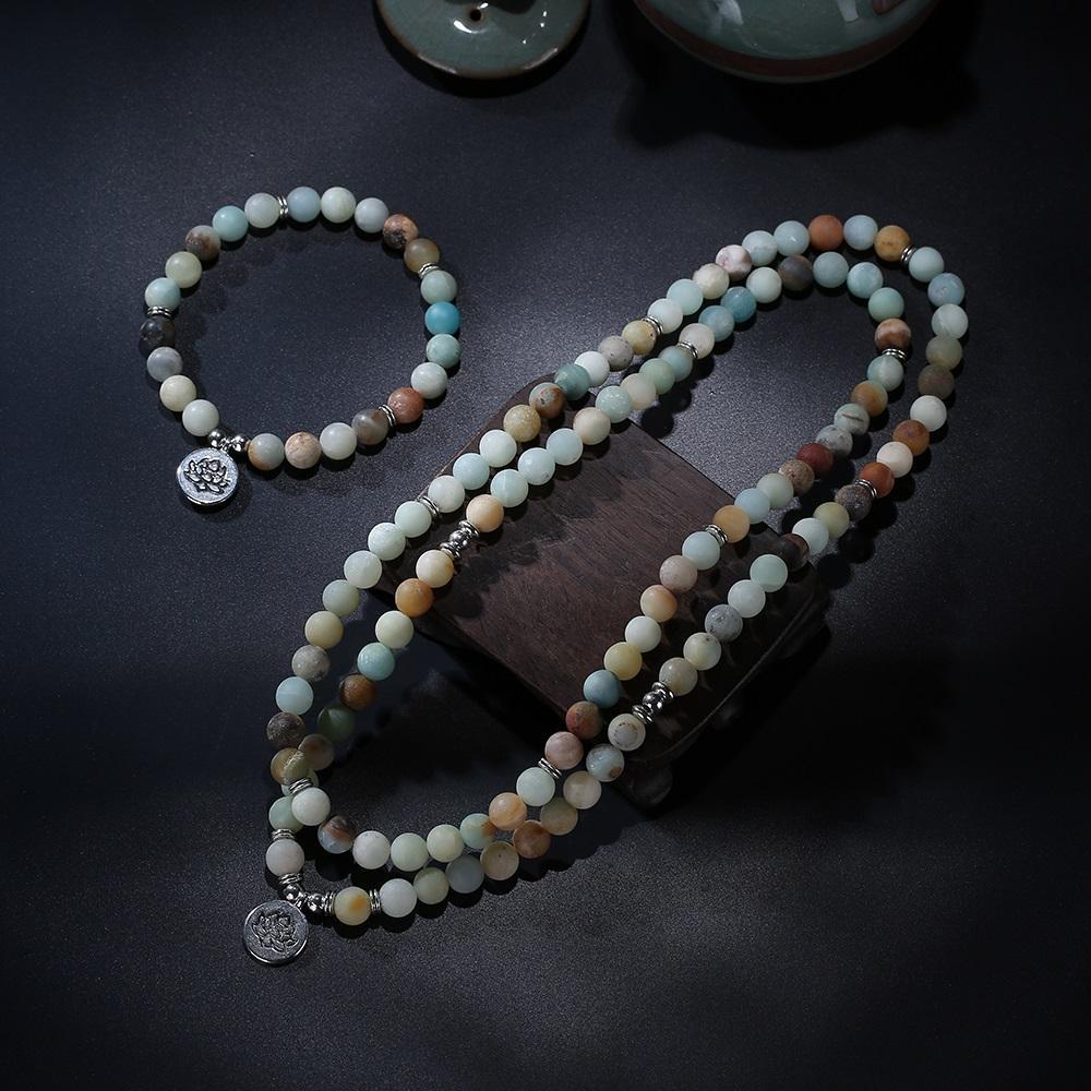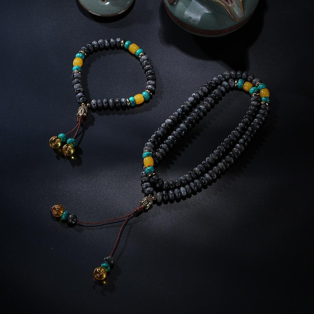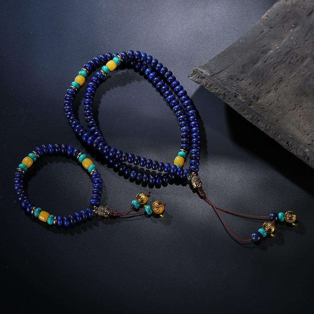 Flat Natural Lapis Lazuli Stone With 6 Syllable Mantra Tassel and Buddha Head Charm Mala Set