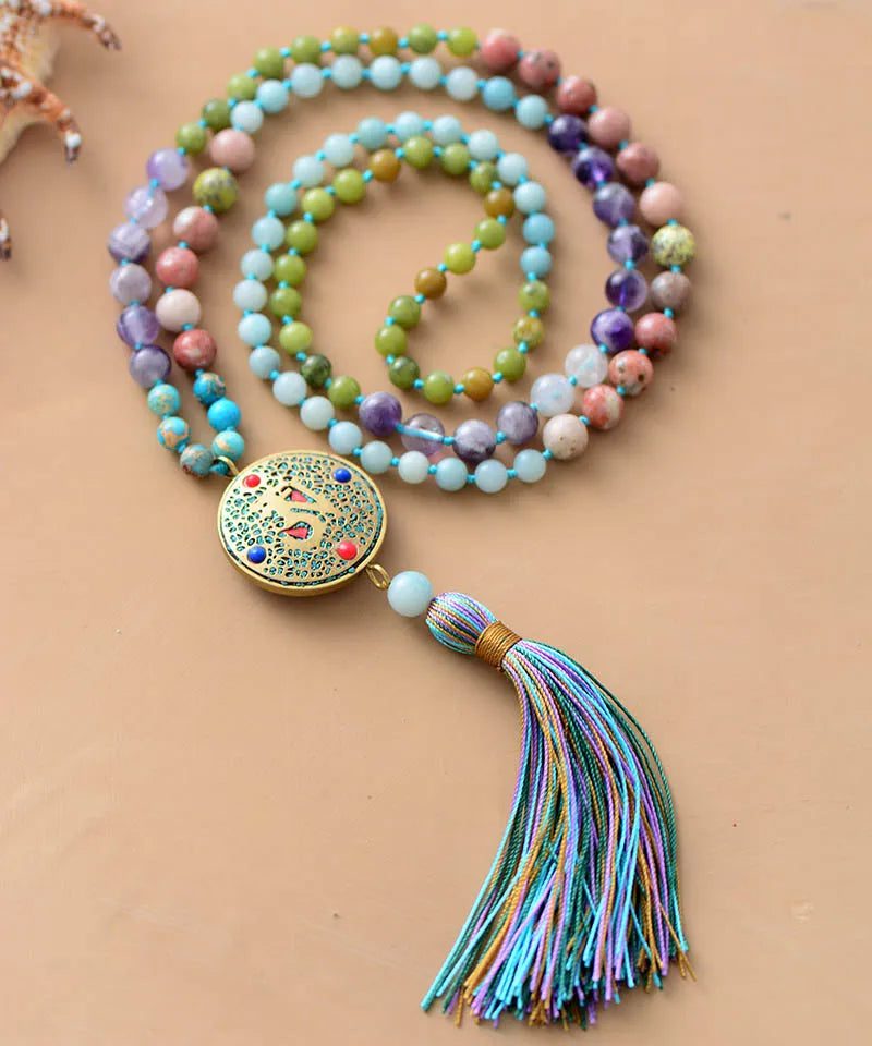 The natural gemstones and long tassel add a touch of effortless bohemian flair to any outfit.