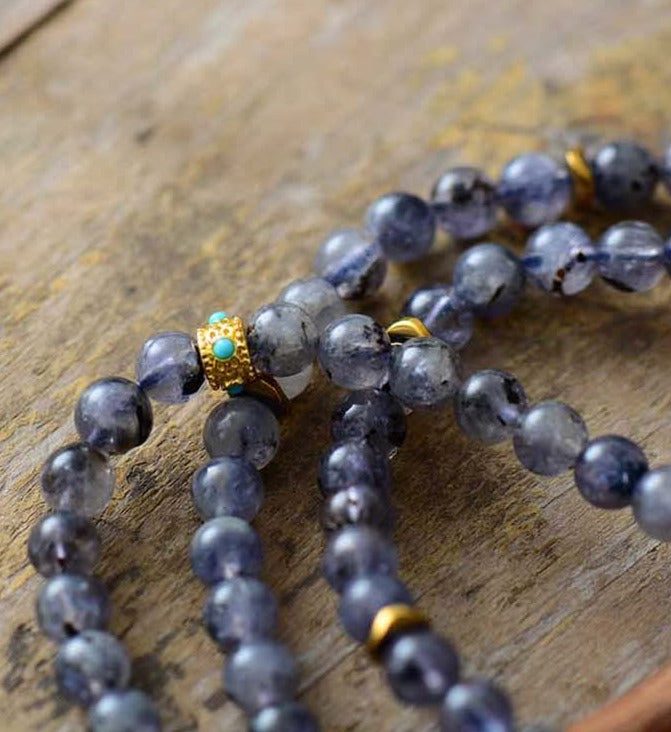 Measuring around 26.8 inches in length, the Mala effortlessly drapes around your neck, serving as a reminder to pause, breathe, and reconnect with your inner self. The Cordierite beads, known for their captivating hues of blue and violet, carry a subtle yet potent energy that resonates with your chakras, promoting a sense of tranquility and spiritual harmony.