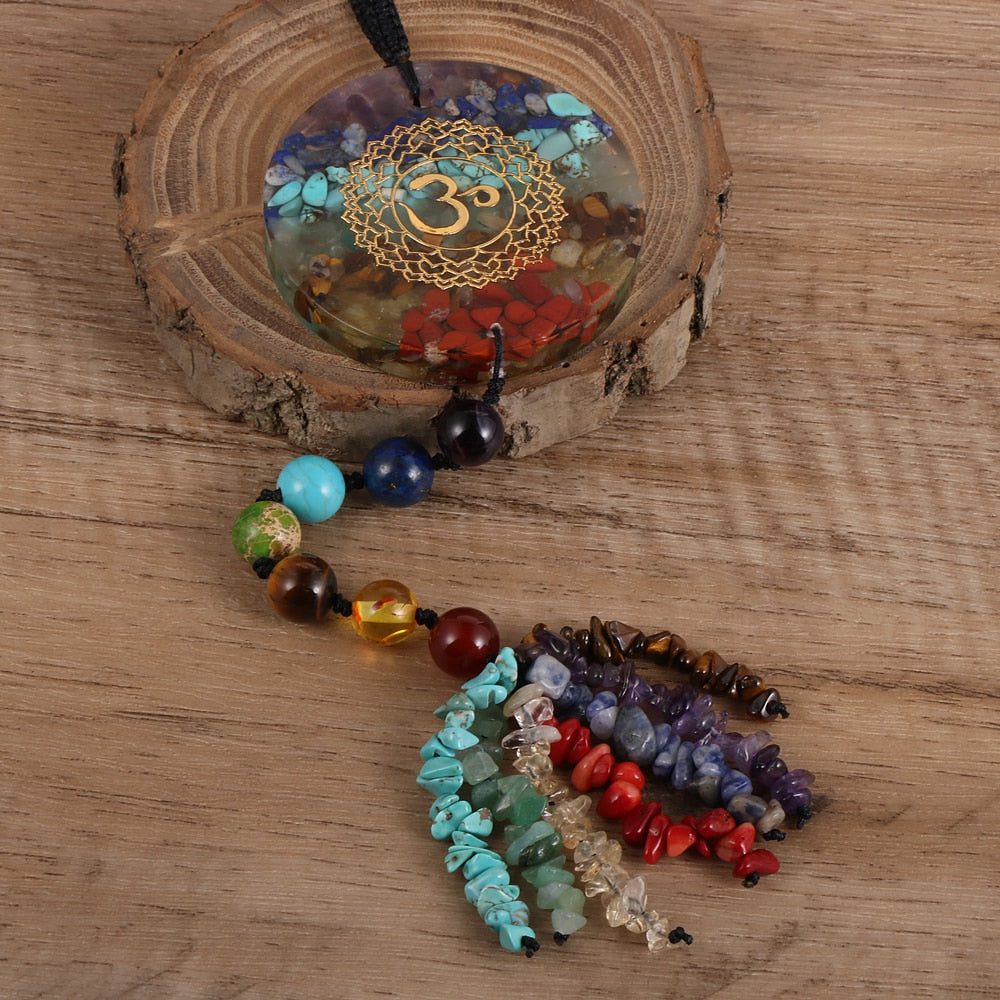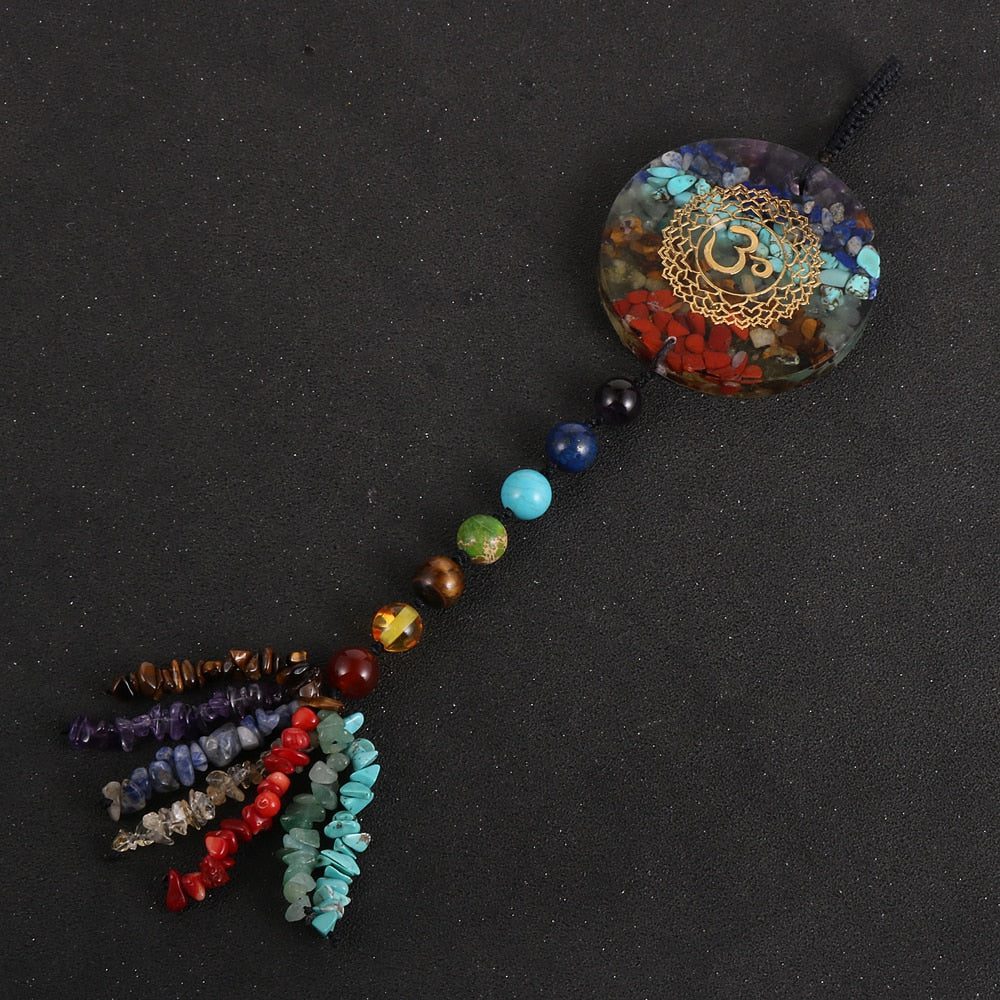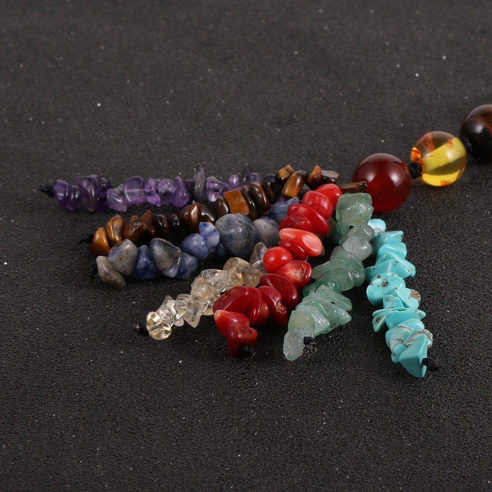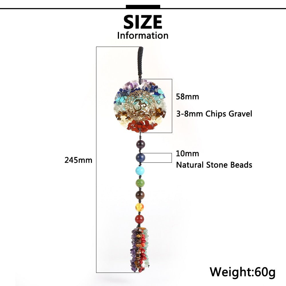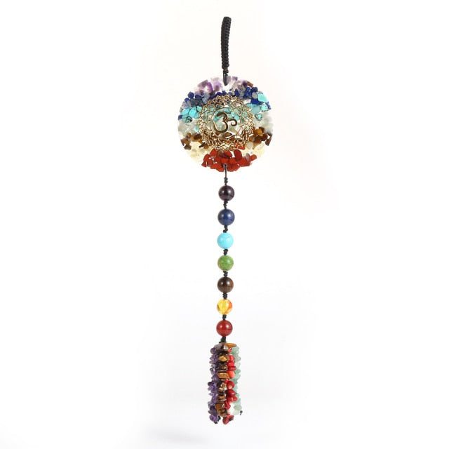 This hanging ornament generally comprises seven stones or charms in various tones or designs, every stone symbolizes the chakras — crown, brow, throat, heart, solar plexus, sacral, and base.