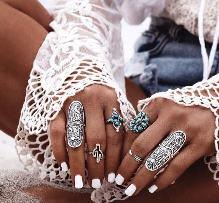 Elaborately crafted by master artisans, don this 9-piece Vintage Turquoise ring set and attract the power of the genuine Turquoise. Made with different sizes to fit every finger, can be worn as a set or by piece to accentuate your style. Bring out that inner boho chic within you!