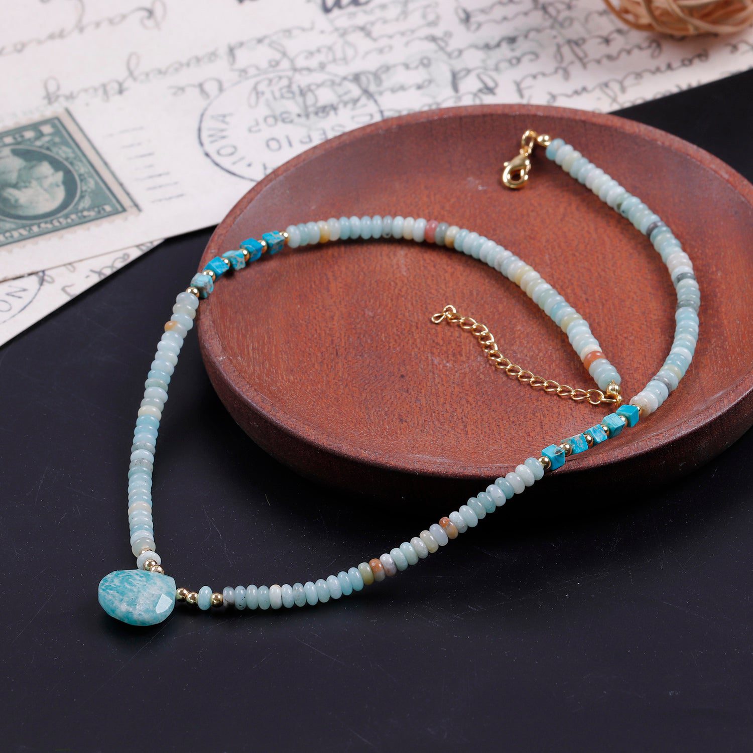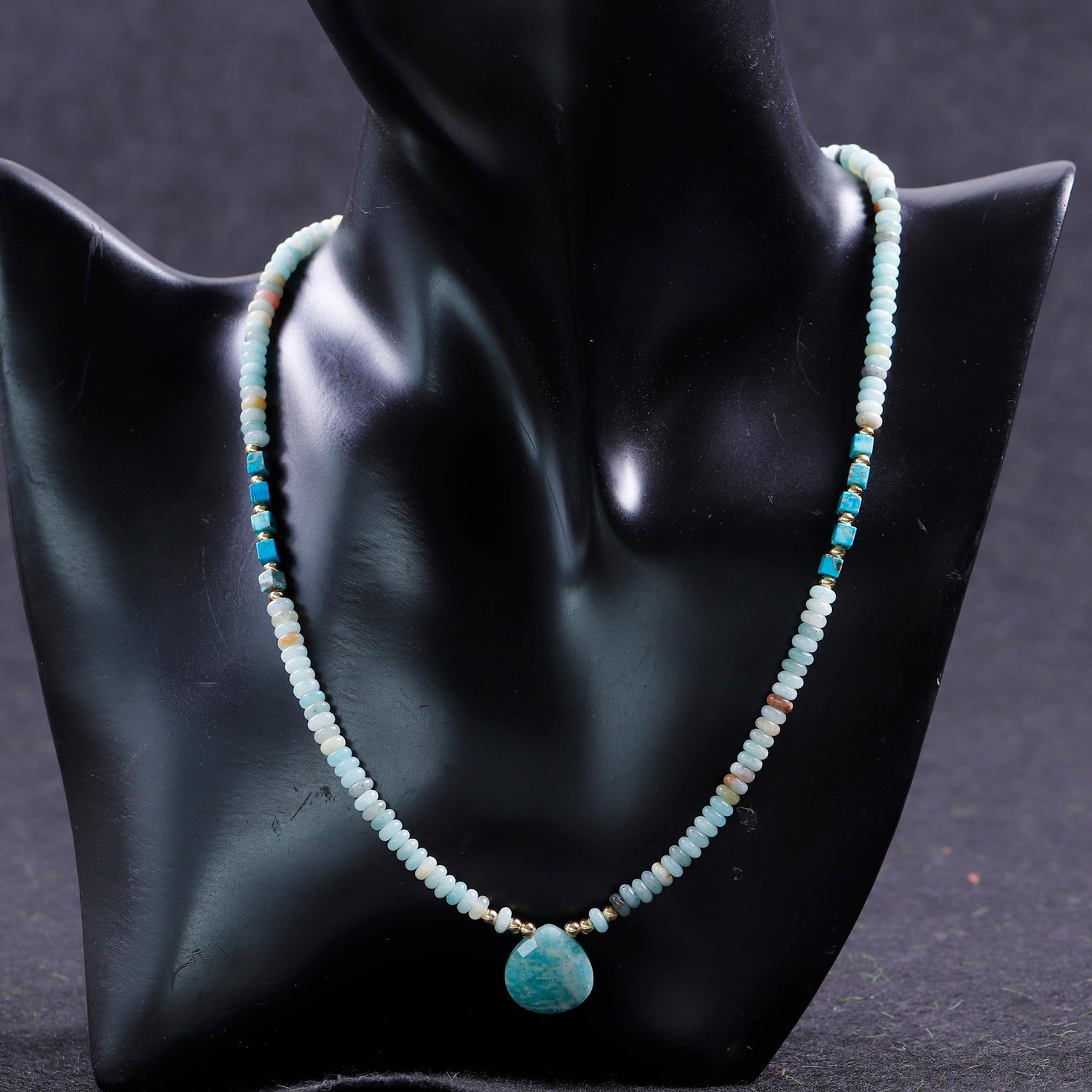 Wearing this necklace allows you to speak from the heart and relaxes your nerves, relieving you of awkward conversations and fear. As soon as fear is overcome, you are able to function far more genuinely. Amazonite's effects promote adventure, new experiences, and harmony.