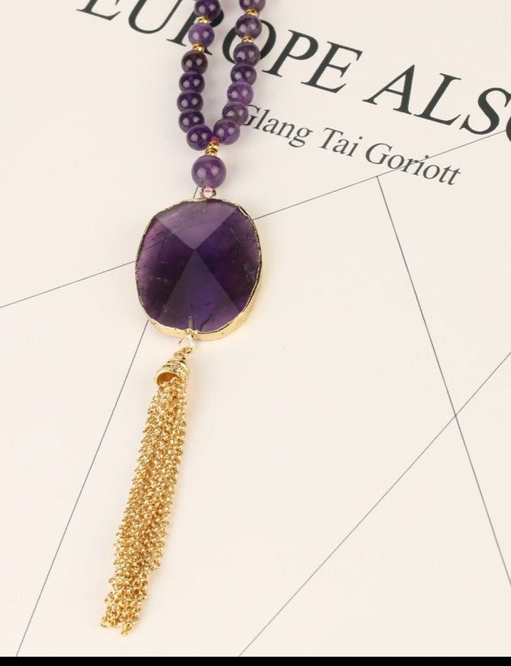 The necklace is made of natural amethyst, which is a beautiful purple stone that is said to promote calmness and tranquility. The angel figurine is a symbol of protection and guidance, and it is said to help promote positive thoughts and emotions.