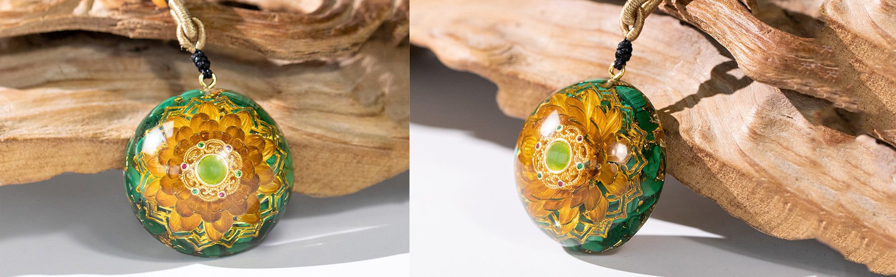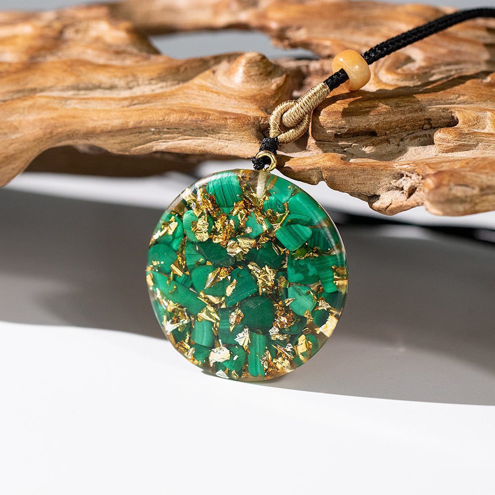 During moments of meditation or introspection, hold the pendant in your hand, allowing its energy to resonate with your intentions. Visualize the pendant's green hues infusing you with vitality, growth, and harmony, while the gold foil enhances your sense of abundance and prosperity.