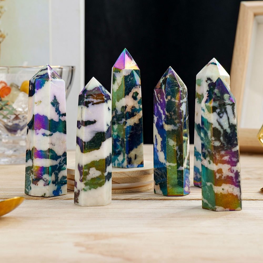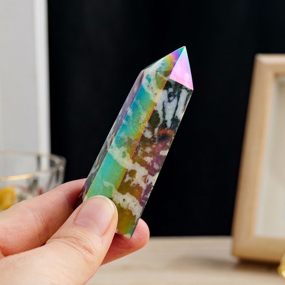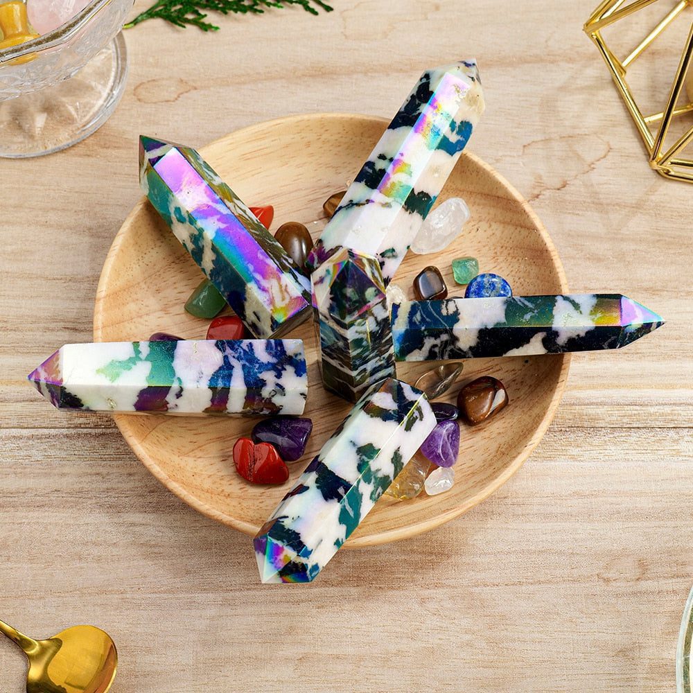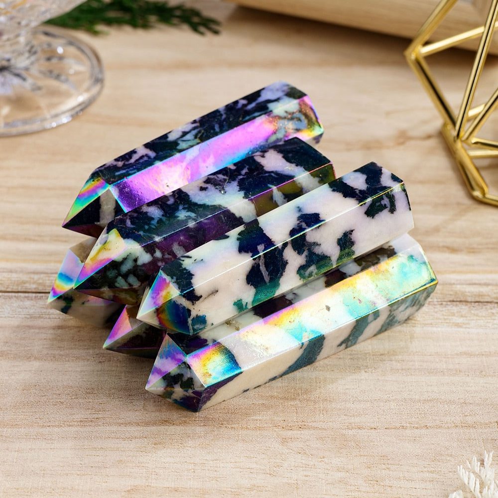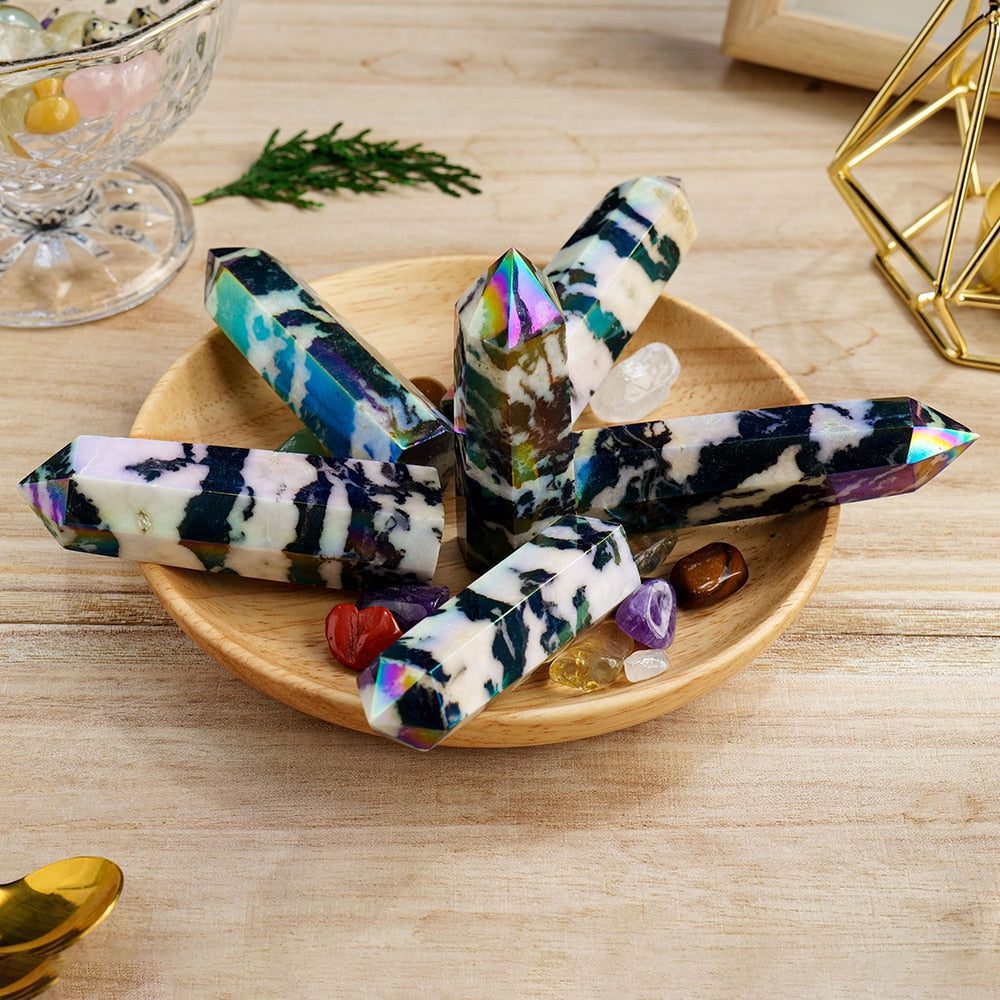 Harness the captivating energies of the Aura Zebra Stone Wand, a remarkable and powerful crystal tool crafted from Jasper. This exquisite wand is more than just a be