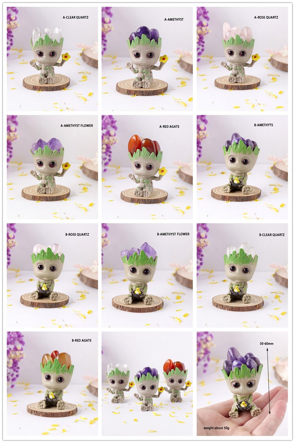Made with precision and care, the Baby Groot Crystal Figurine showcases the exquisite combination of Amethyst, Clear Quartz, Red Agate, and Rose Quartz. Each crystal is thoughtfully chosen for its unique properties, creating a harmonious blend that radiates positive energy.