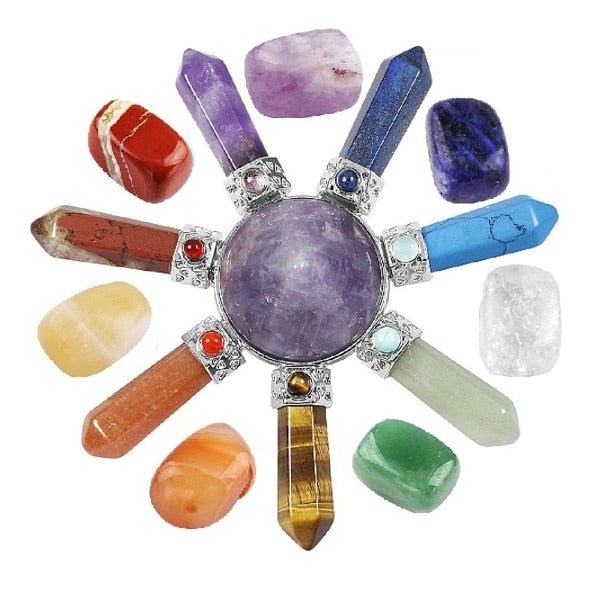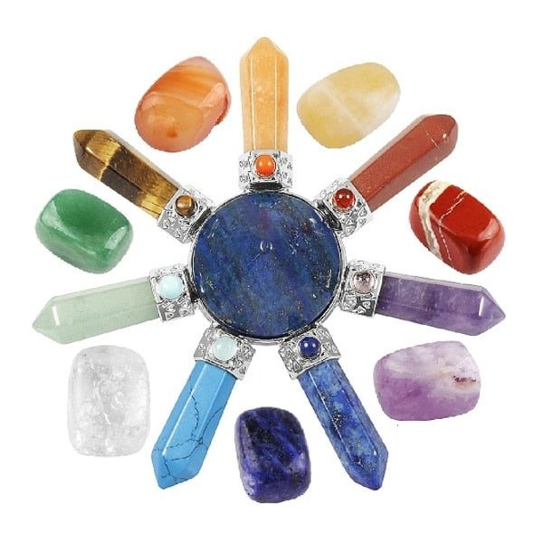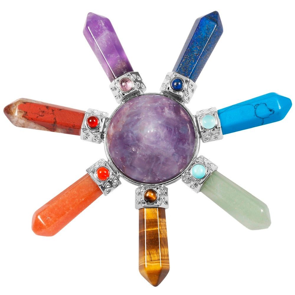 This Generator has 7 points attached to a pyramid at the center. The center pyramid amplifies the seven directions of energy of the Earth through its apex. Natural healing stones are combined in 7 points with the most powerful crystals on Earth and each stone represents each point of the chakra with its tumbled stones too. It includes