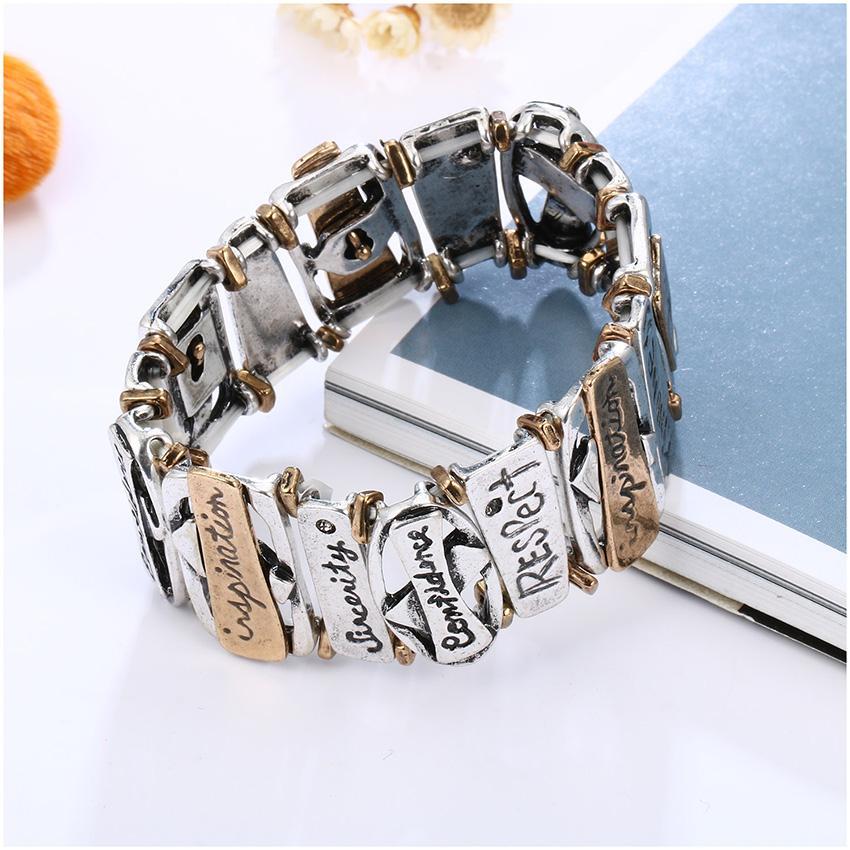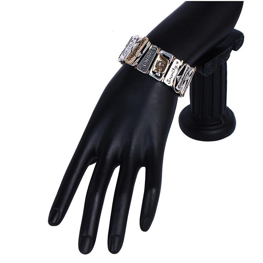 Need a good word or two to start your day? This unique bracelet is just the thing for you. The bracelet is made with metal plates in beautiful antique gold and antique silver colors engraved with different positive and inspiring words that will keep you in a good vibe all day long.