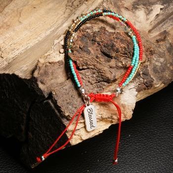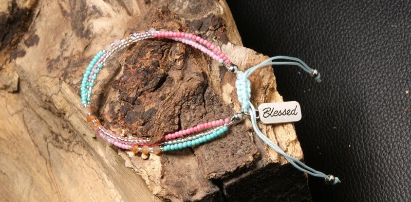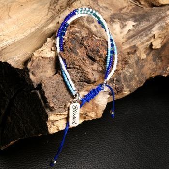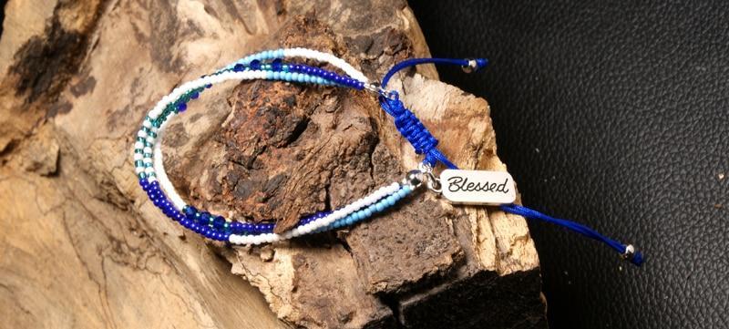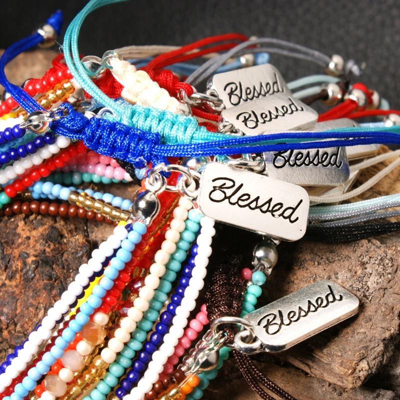 The bracelet is embellished with a silver plated metal tag engraved with the word "Blessed".