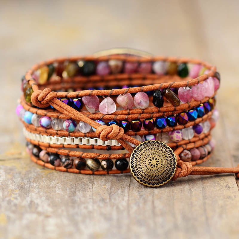 Our Boho Jasper Wrap Bracelet holds a central stone encased in gold plated alloy metal, whilst the smaller stones are weaved together off a soft cord (PU leather).