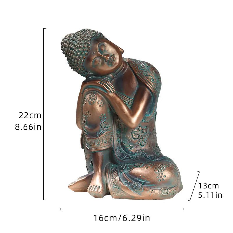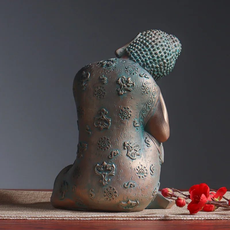 Take a look at this: Buddha's hands and head are resting on one knee, which is drawn up against his chin, and his eyes are closed. This pose exudes total relaxation and tranquillity, and it represents the restfulness and calm that can be attained through meditation practice. The peaceful expression on the face beautifully captures the moment's pure stillness.