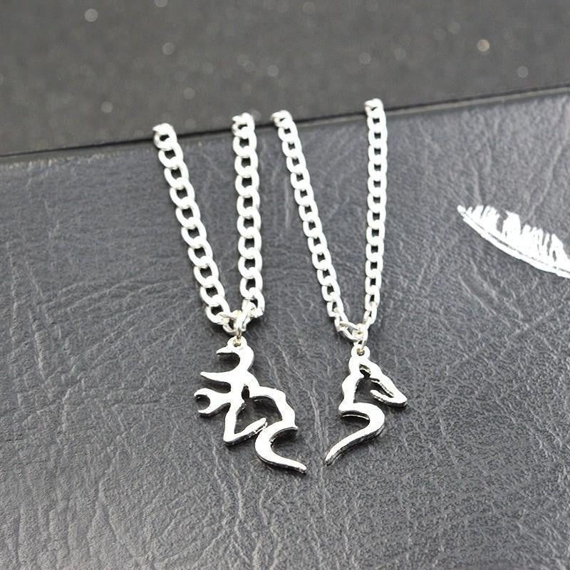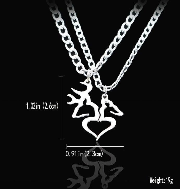 This Buck And Doe Heart Pendant Couples Necklace Set is an imagery of the popular romantic phrase "His doe, her buck" and is a perfect item for couples in love. Made with high quality metal alloy in a polished silver color finish, this set has been exquisitely shaped into outlines of a buck and a doe forming a beautiful heart when joined together.