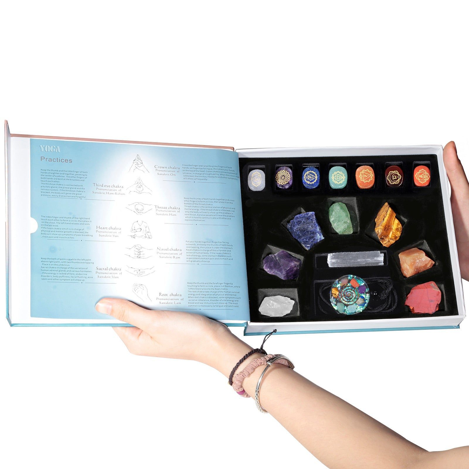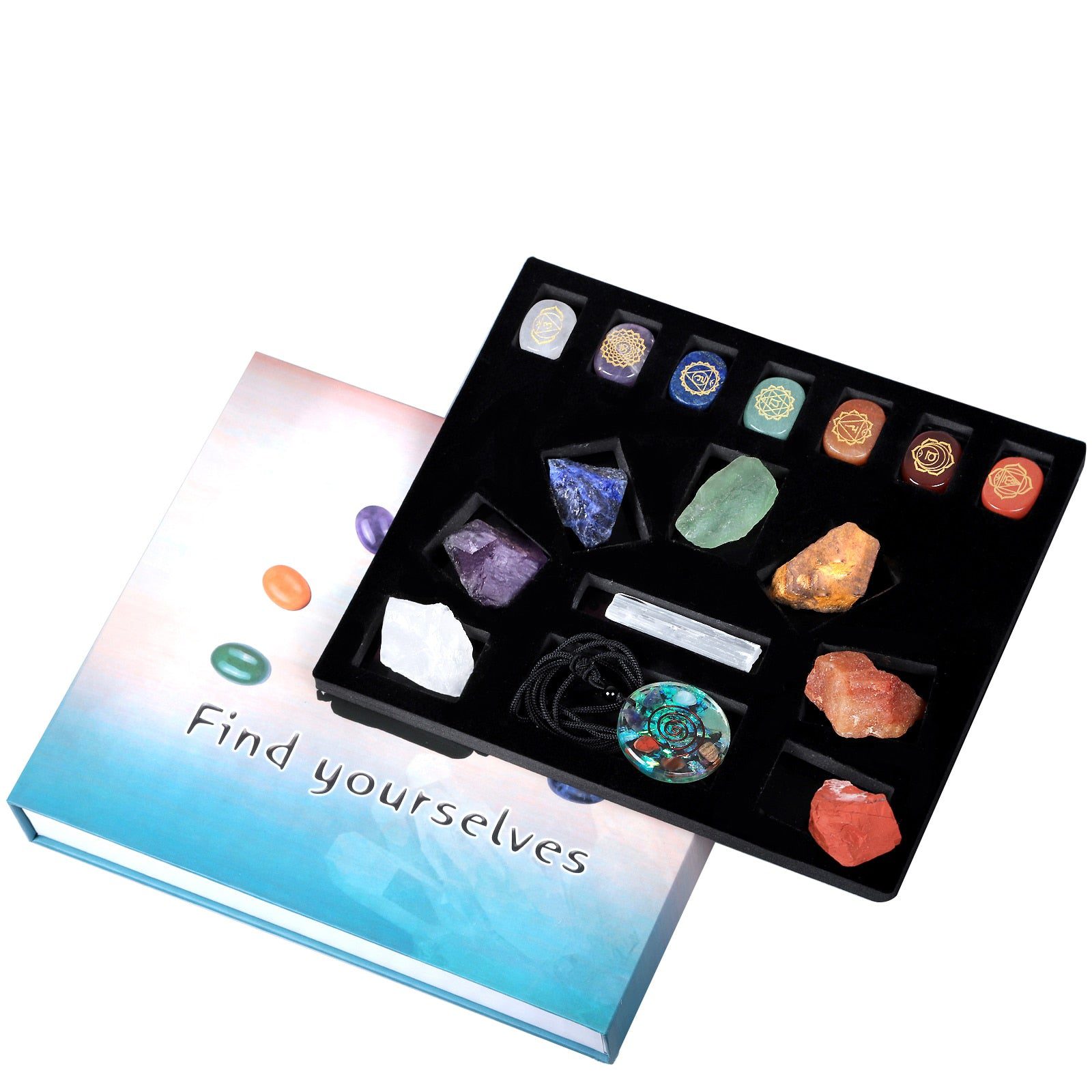 Quantity:1 Set (7 Chakra Raw Stones, 7 Chakra Engraved Palm Stones,1x Selenite Crystal Wand, 1x Chakra Orgone Pendant Necklace)