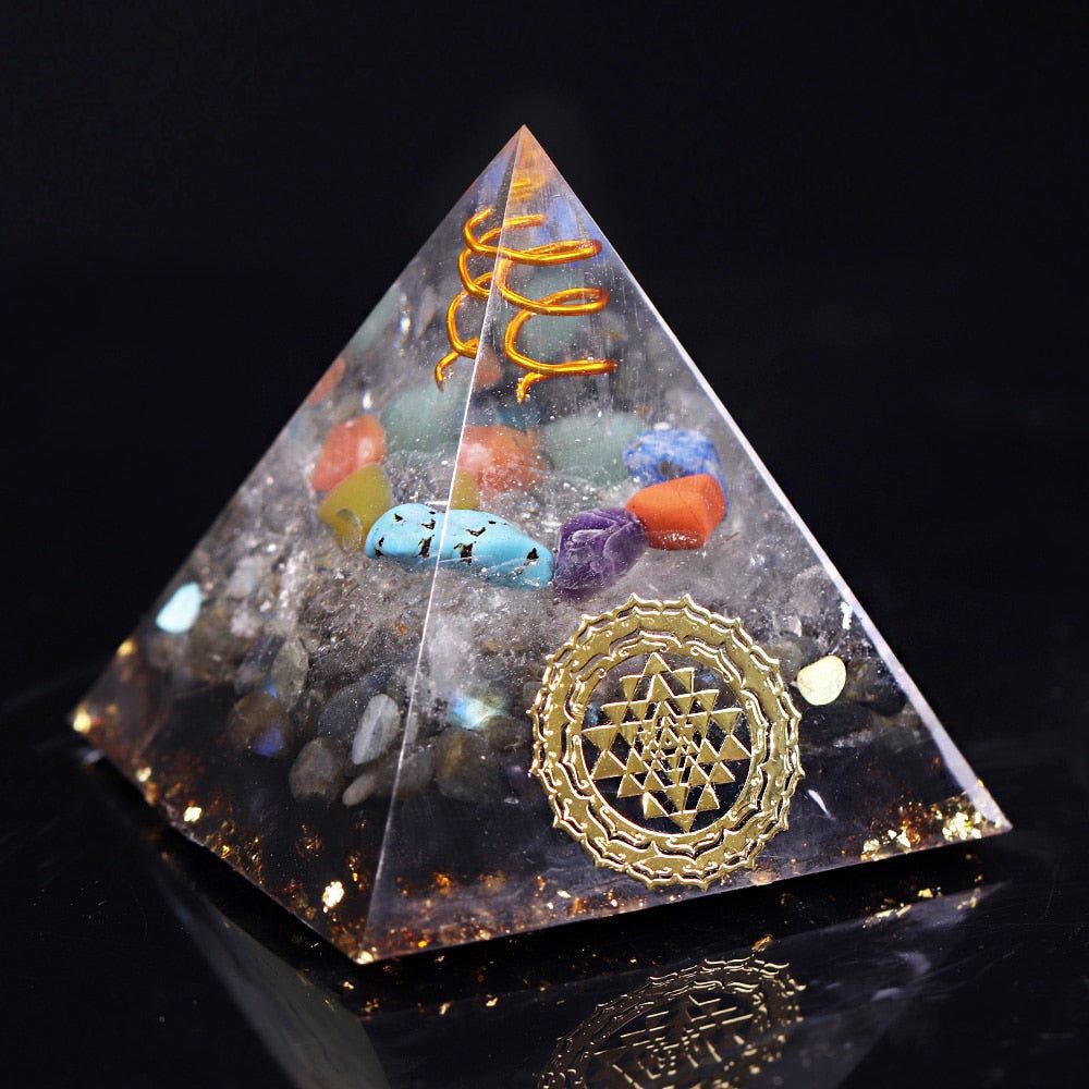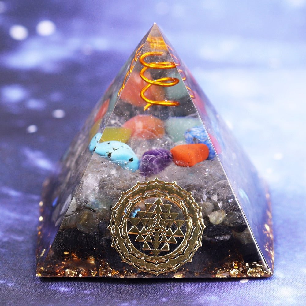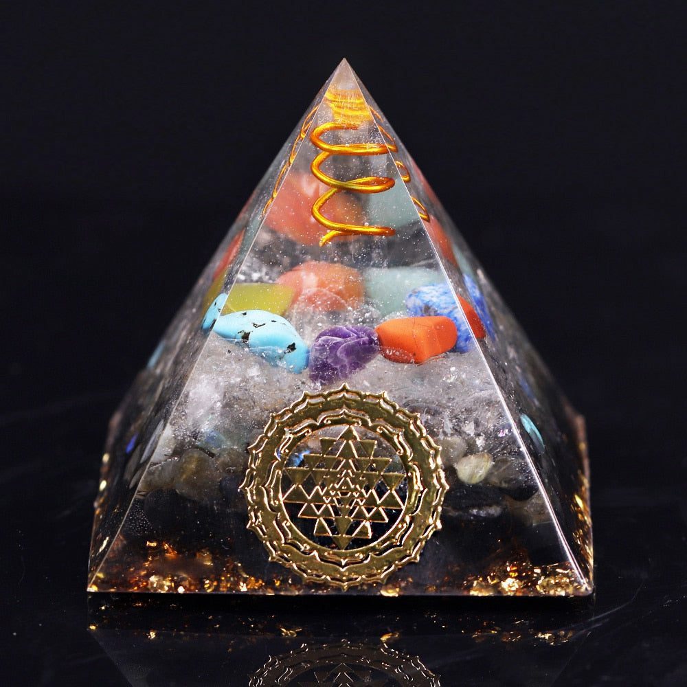 This Chakra Protection Orgone Pyramid is a 4 sided pyramid, made from gemstones and crystals. Each of the layers correspond to the etheric energies of each of the 7 main chakras in the human body.