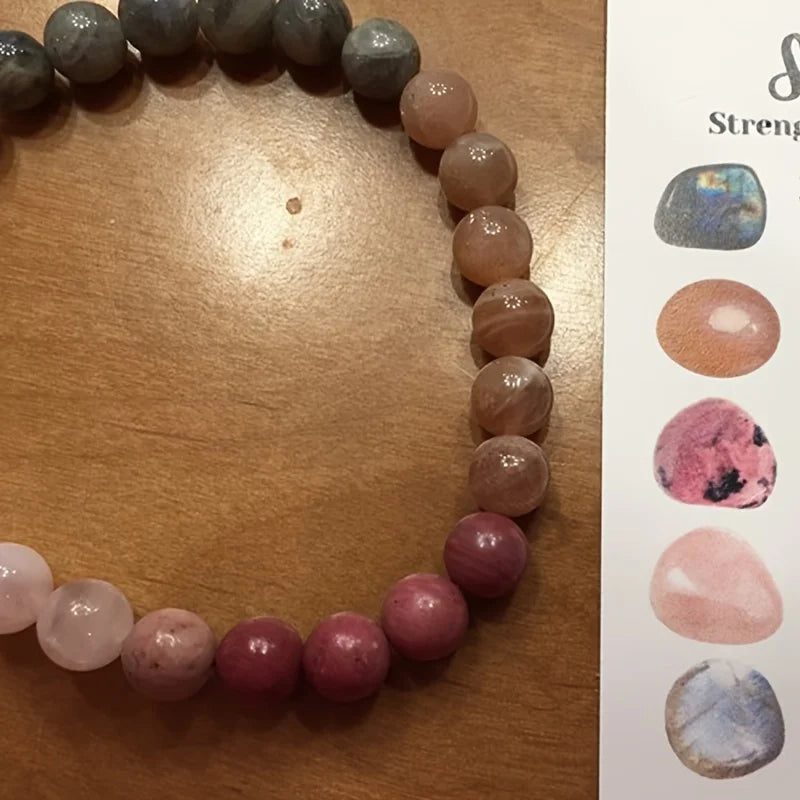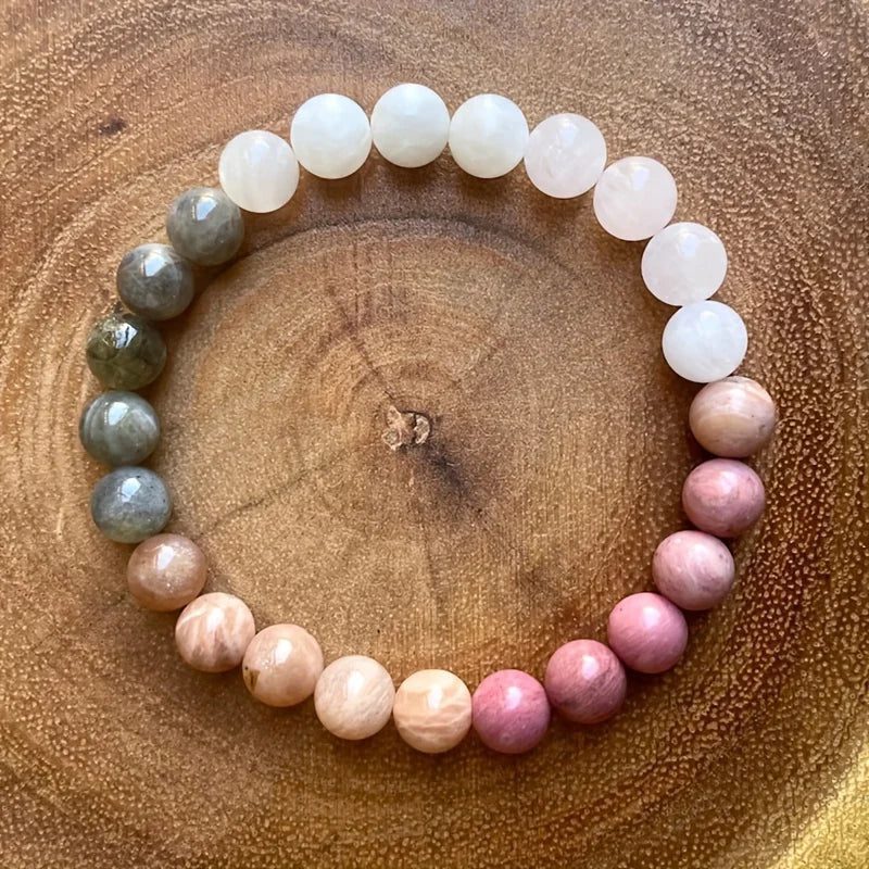 This bracelet will most likely help you given that it is made of beautiful pink Rhodonite beads combined with soothing green to white jade beads. Rhodonite represents compassion and emotional healing, whereas jade is known for its harmony and abundance properties. They work together to bring about a sense of calm and balance.