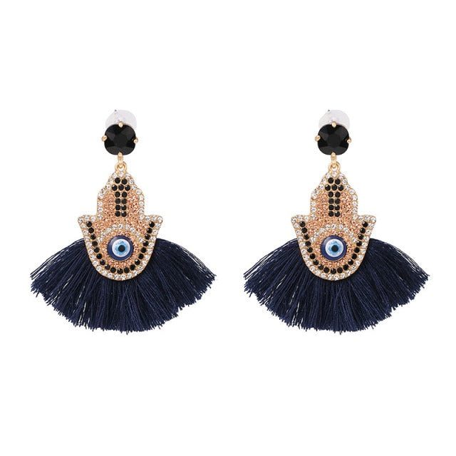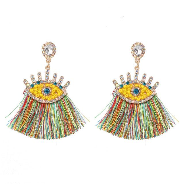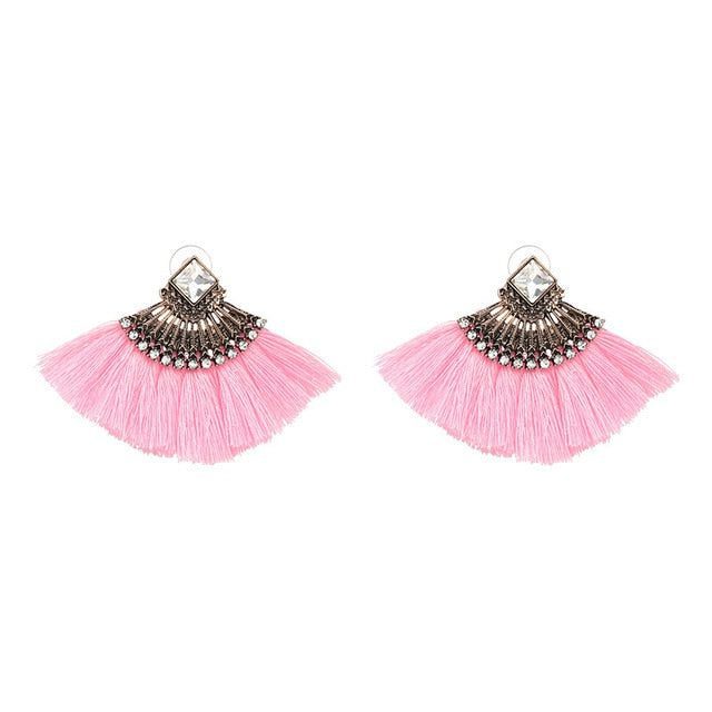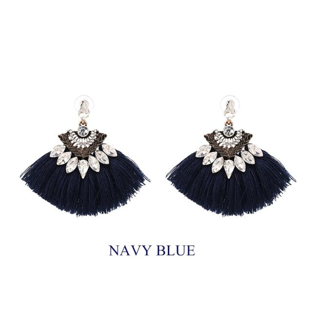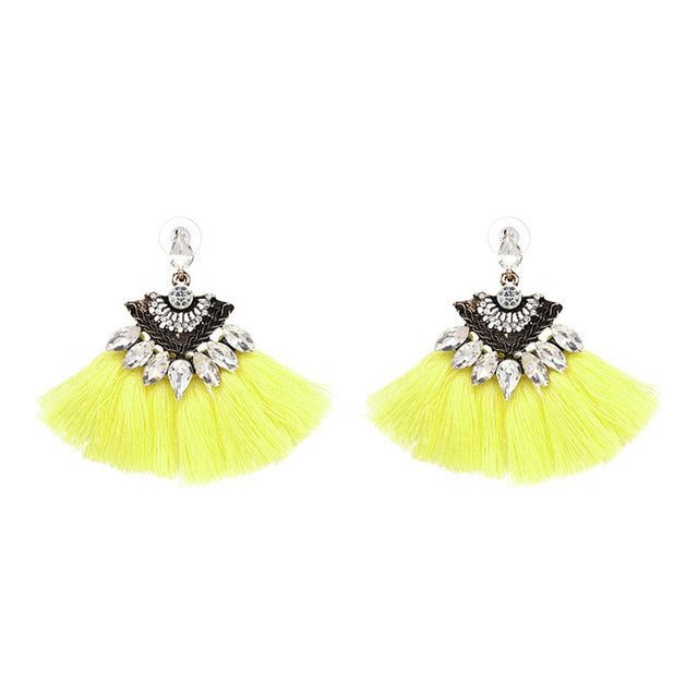 The vibrant colored tassels are arrange in a beautiful fan style like a burst of color from the lovely crystal studded embelishments that create stunning combination. A beautiful piece to fit your style, these stylish earrings are perfect for any outfit whether you dress down or dress up, its the perfect accessory that just completes your look.
