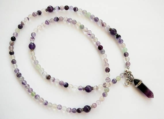 Our Healing Om Charm 108 Mala is made with fluorite beads and black obsidian pendant with an Om charm.