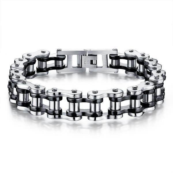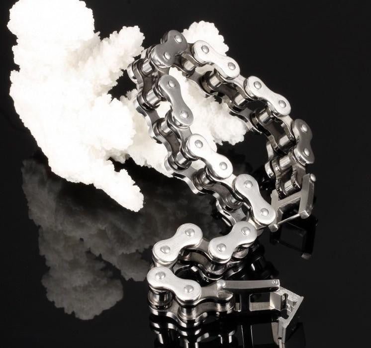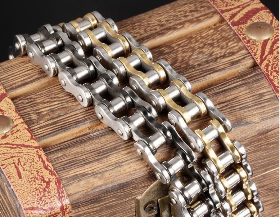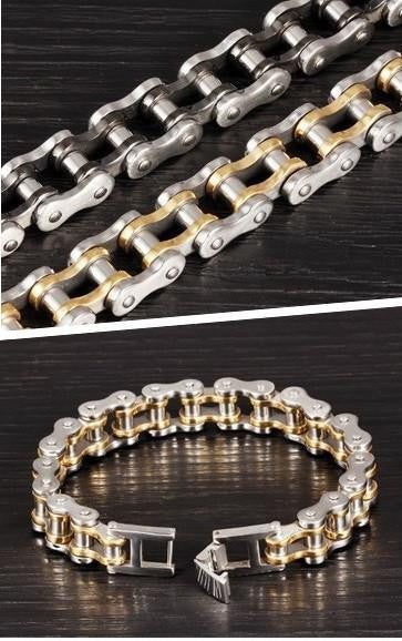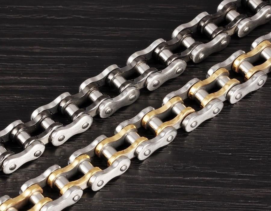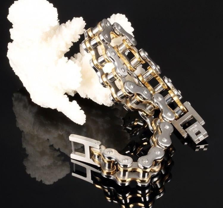 This bracelet is exquisitely made into the likeness of a motorcycle chain. Take your love for riding to the next level with this Cool Stainless Steel Men's Biker Chain Bracelet in your choice of color from silver, gold, two-toned gold silver, and silver black. It's the perfect piece for you or the perfect gift to someone who loves to ride through the wind because riding isn't just riding, its a lifestyle.
