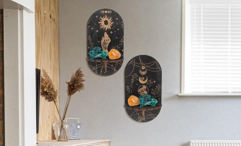 How to use: Place the Cosmic Crystal Shelf Duo on any wall or surface in your living space, creating a dedicated area to display your crystals, sacred objects, or other spiritual items.
