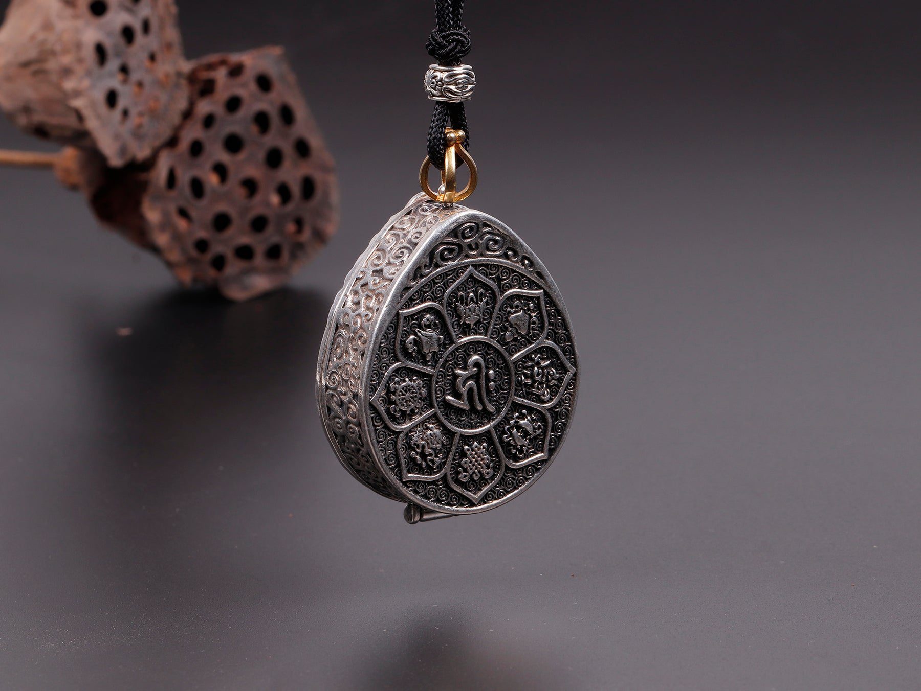 This beautiful amulet is made with silver-plated copper and is shaped like a ghau, which is a sacred Tibetan symbol that is said to represent the power of manifestation. The amulet is about 5cm x 4cm in size and weighs about 25g.