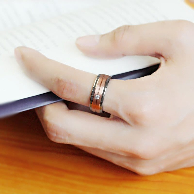This beautiful ring is made with stainless steel and cubic zirconia, and it features a double groove design that is both stylish and comfortable to wear. The ring is about 8mm in width and is available in a variety of sizes to fit most fingers.
