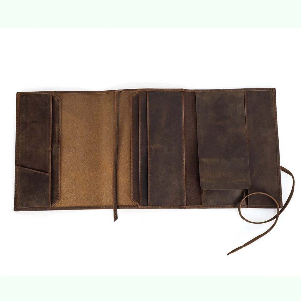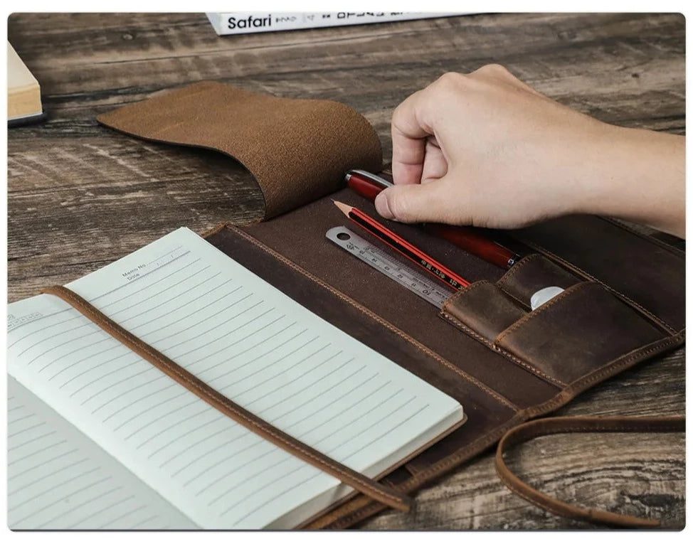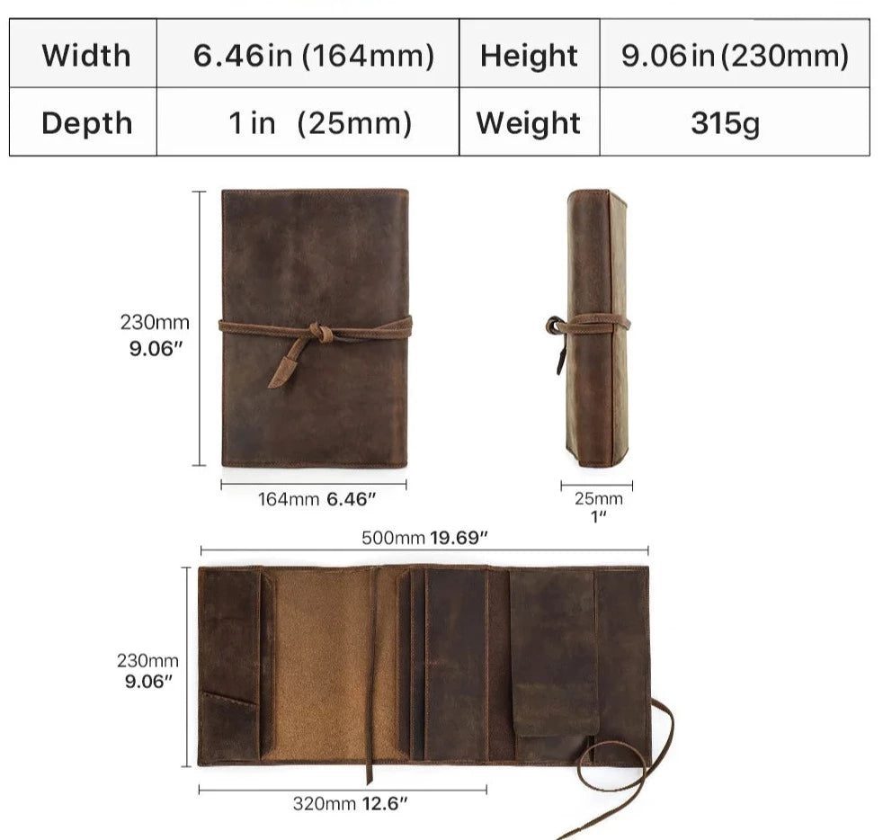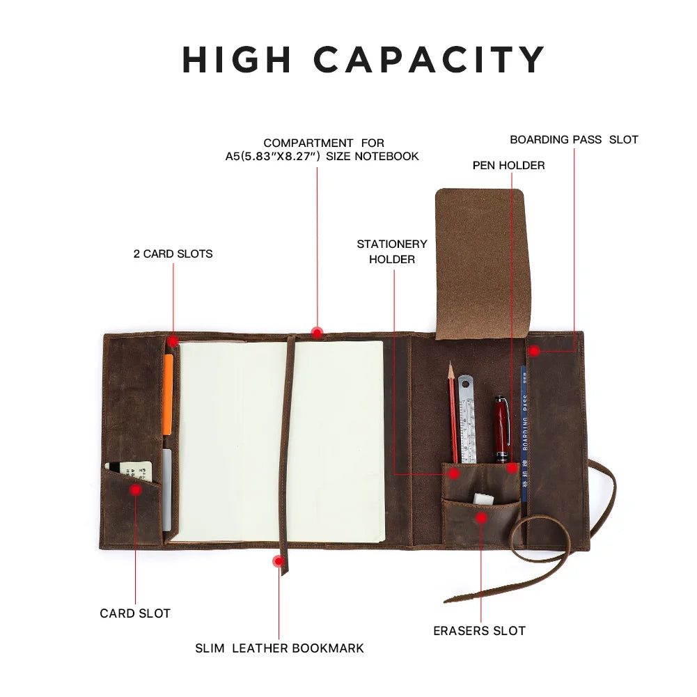 Several compartments for a 5.83"*8.27" notebook or journal, 3 card slots, stationary/pen holders, and a boarding pass slot. Ideal for your next trip!