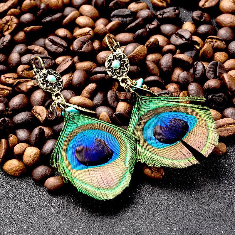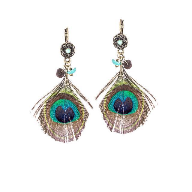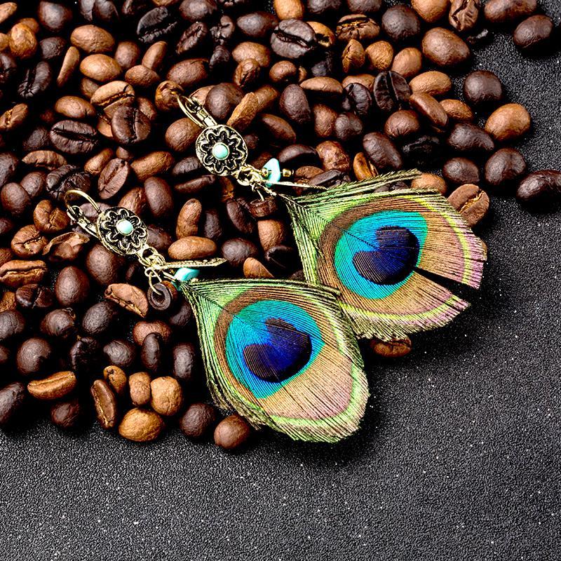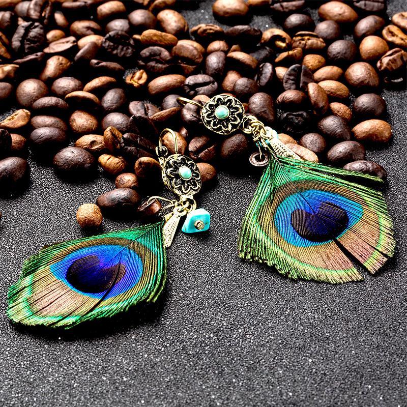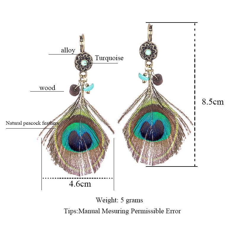 The ear hook style makes it easy to wear. Dangling from the turquoise stud charm are vibrant colored real peacock feathers with a golden charm and stone and wood bead accents that create stunning combination. A beautiful piece to fit your style, these stylish earrings are perfect for any outfit whether you dress down or dress up, its the perfect accessory that just completes your look.
