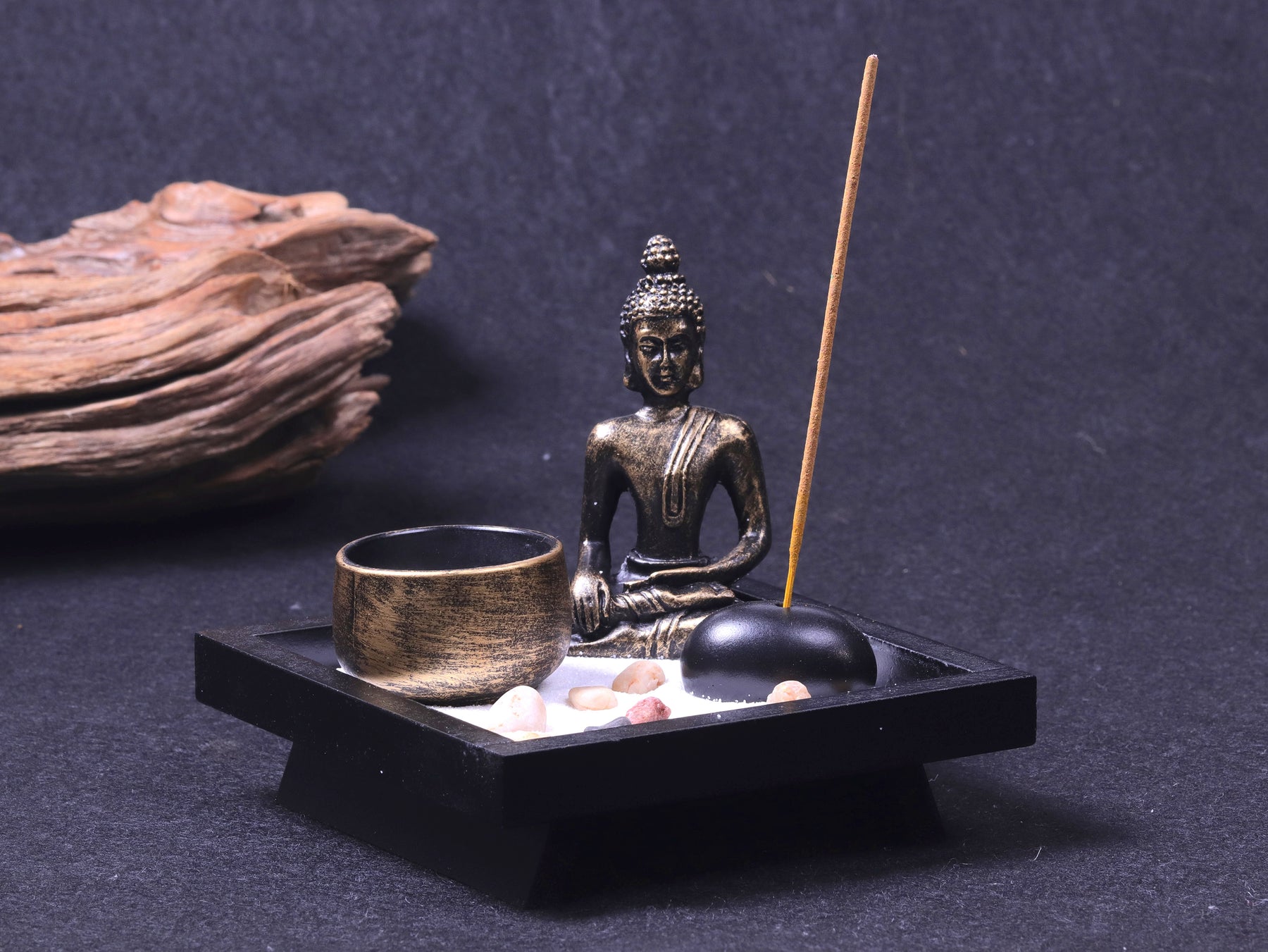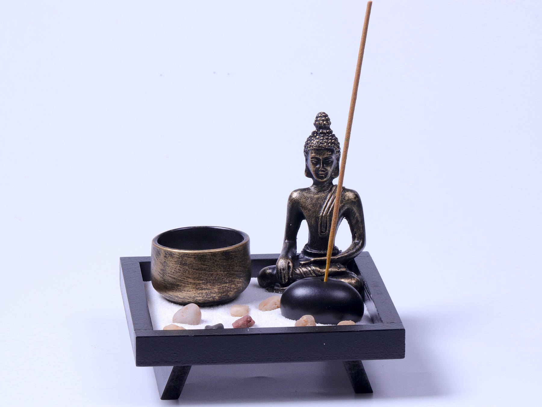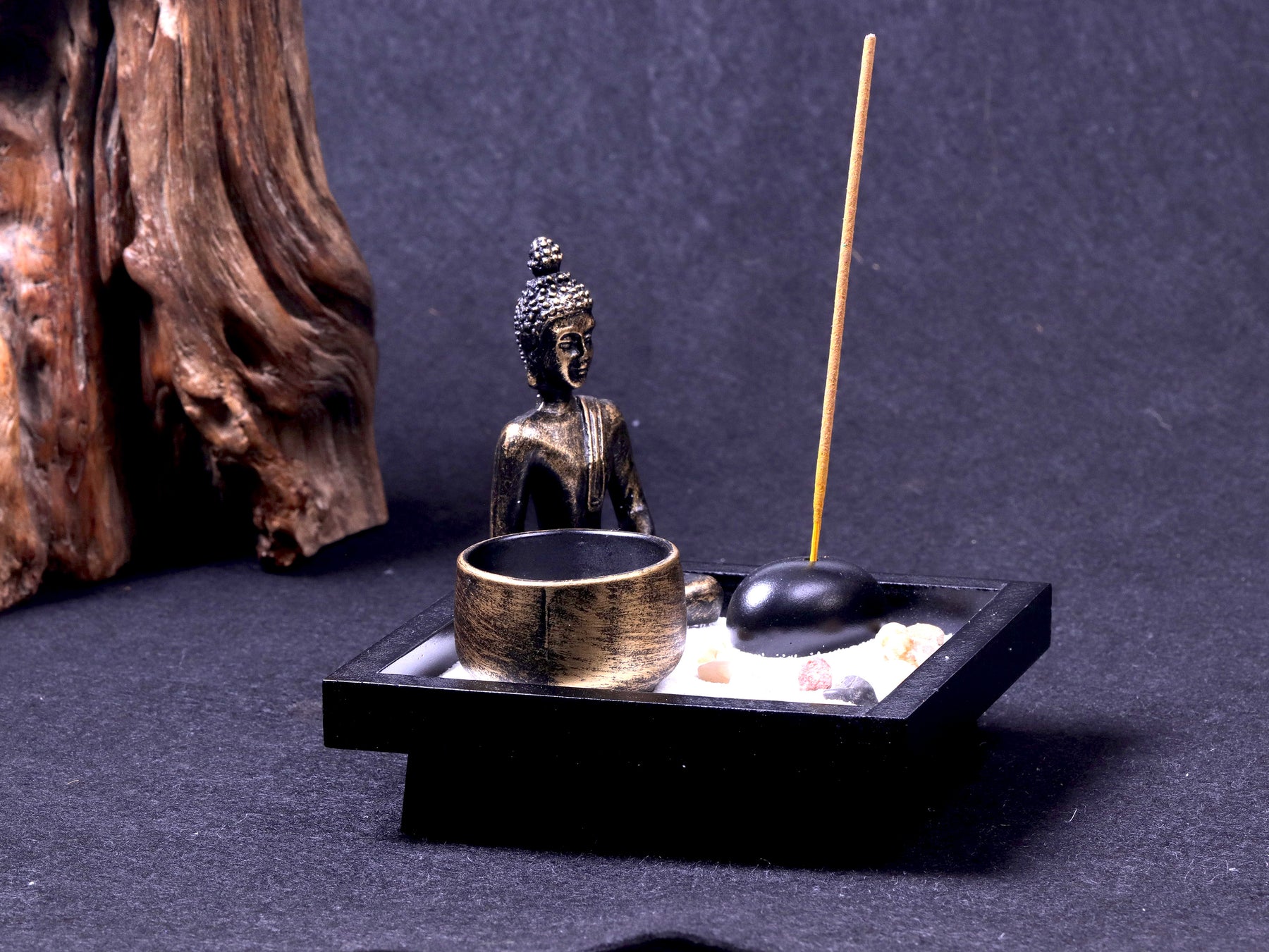 Comprising a meticulously designed ensemble, this Zen garden is a complete experience that includes a black base, a Buddha statue, a candle holder, a rock incense stick holder, a bag of sand, and a bag of small rocks.