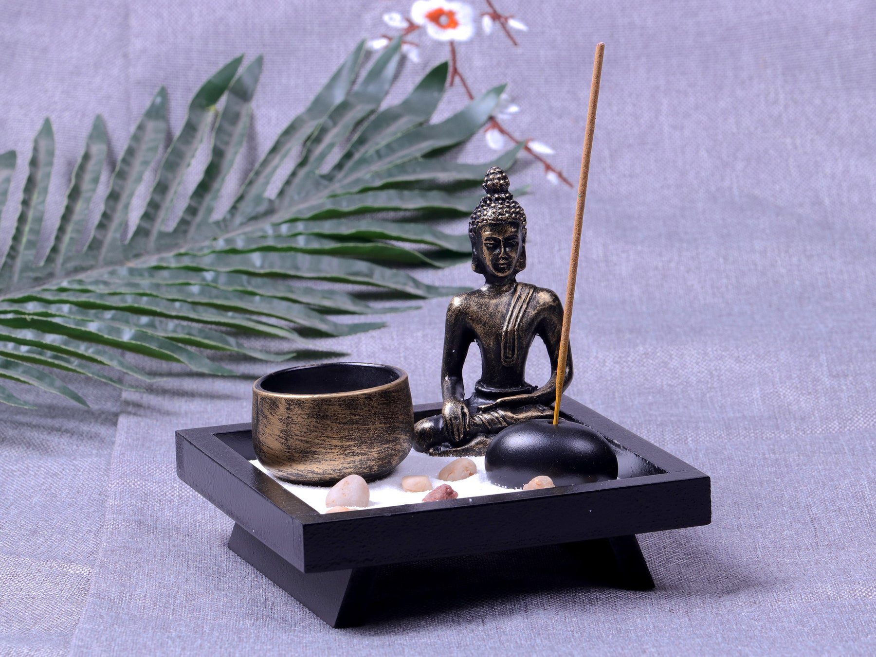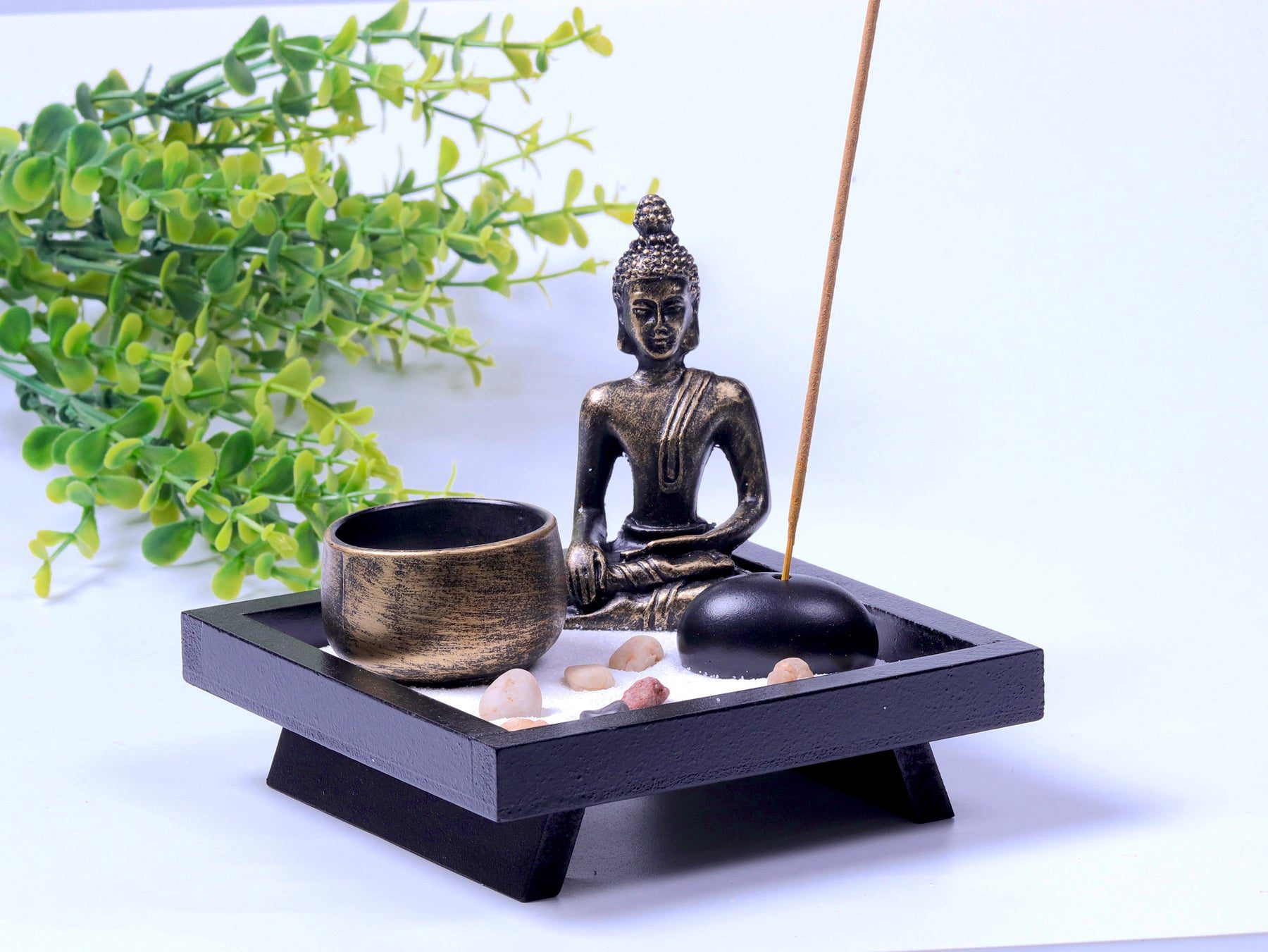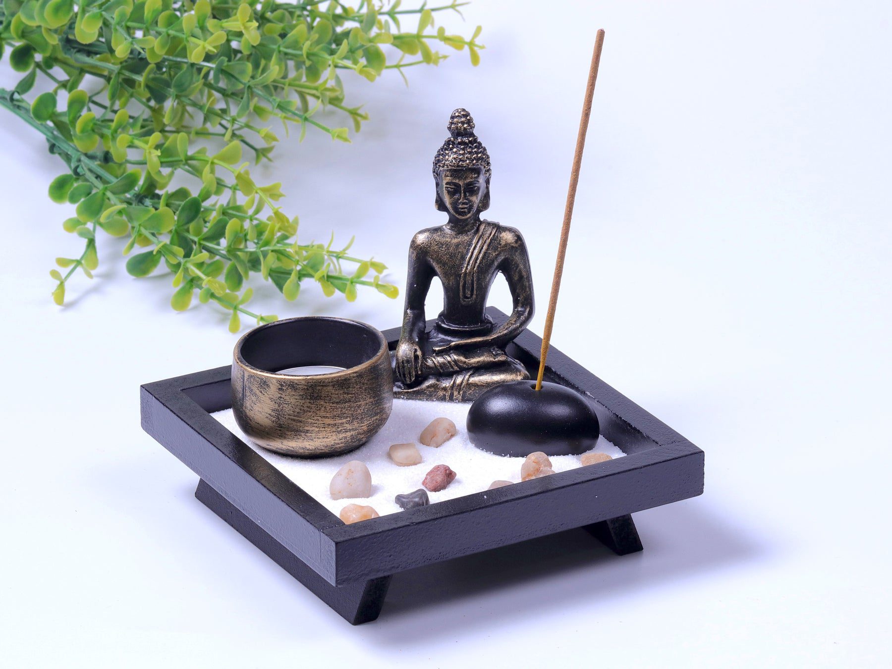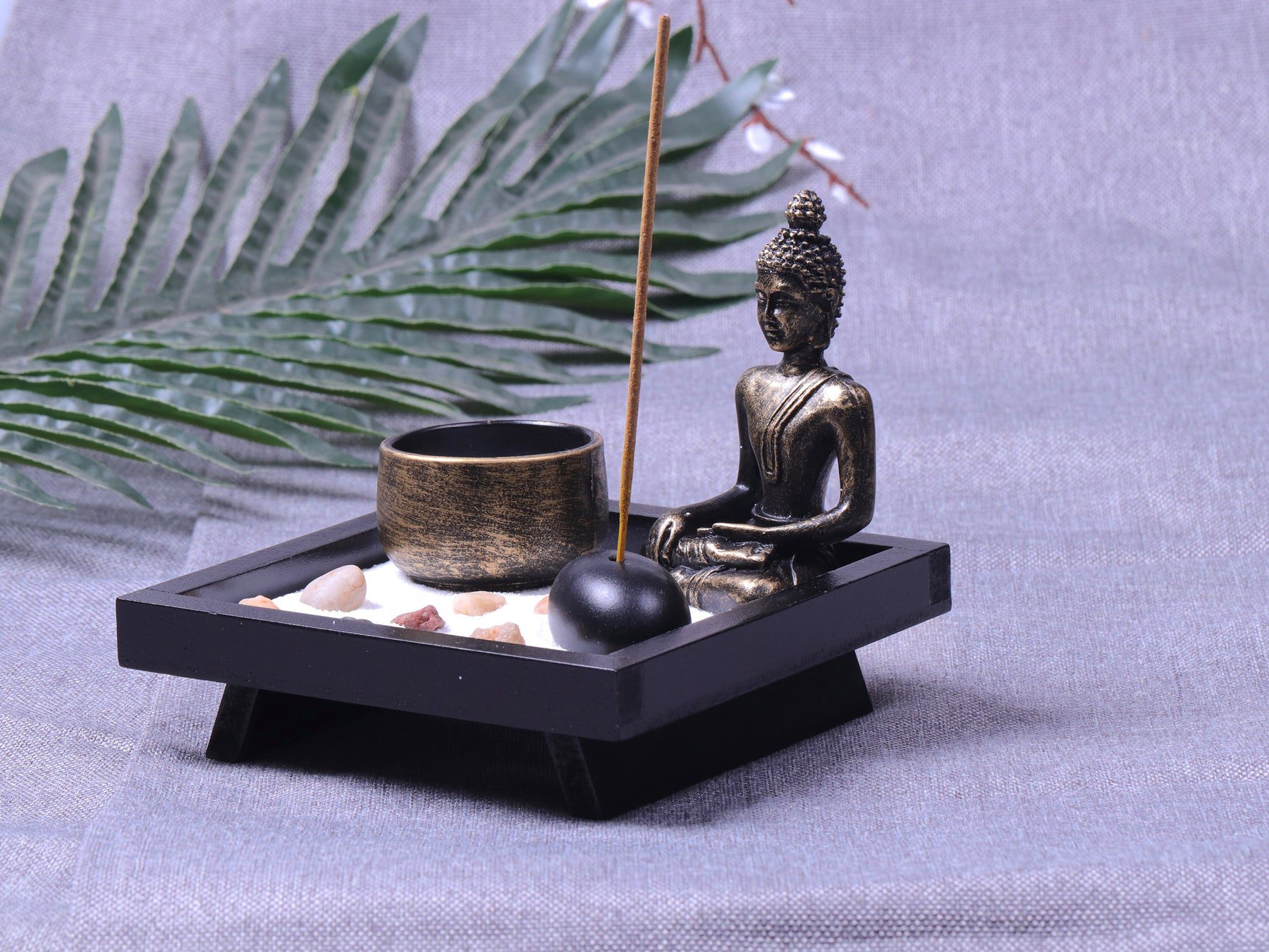 Comprising a meticulously designed ensemble, this Zen garden is a complete experience that includes a black base, a Buddha statue, a candle holder, a rock incense stick holder, a bag of sand, and a bag of small rocks.