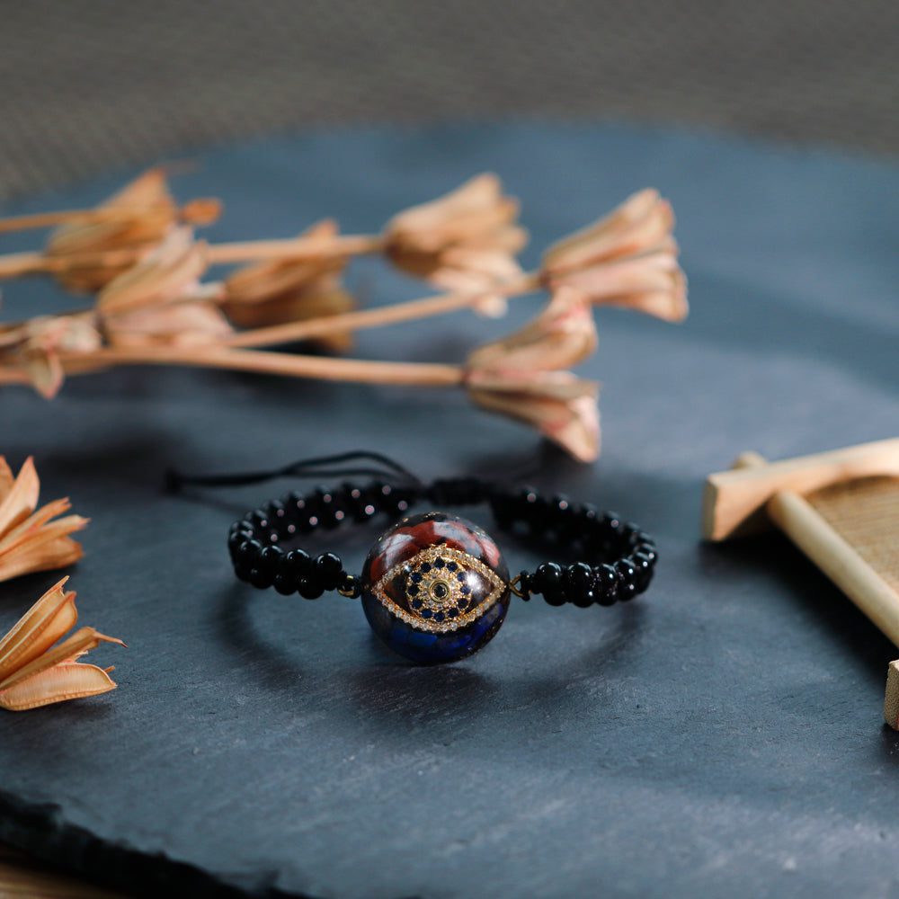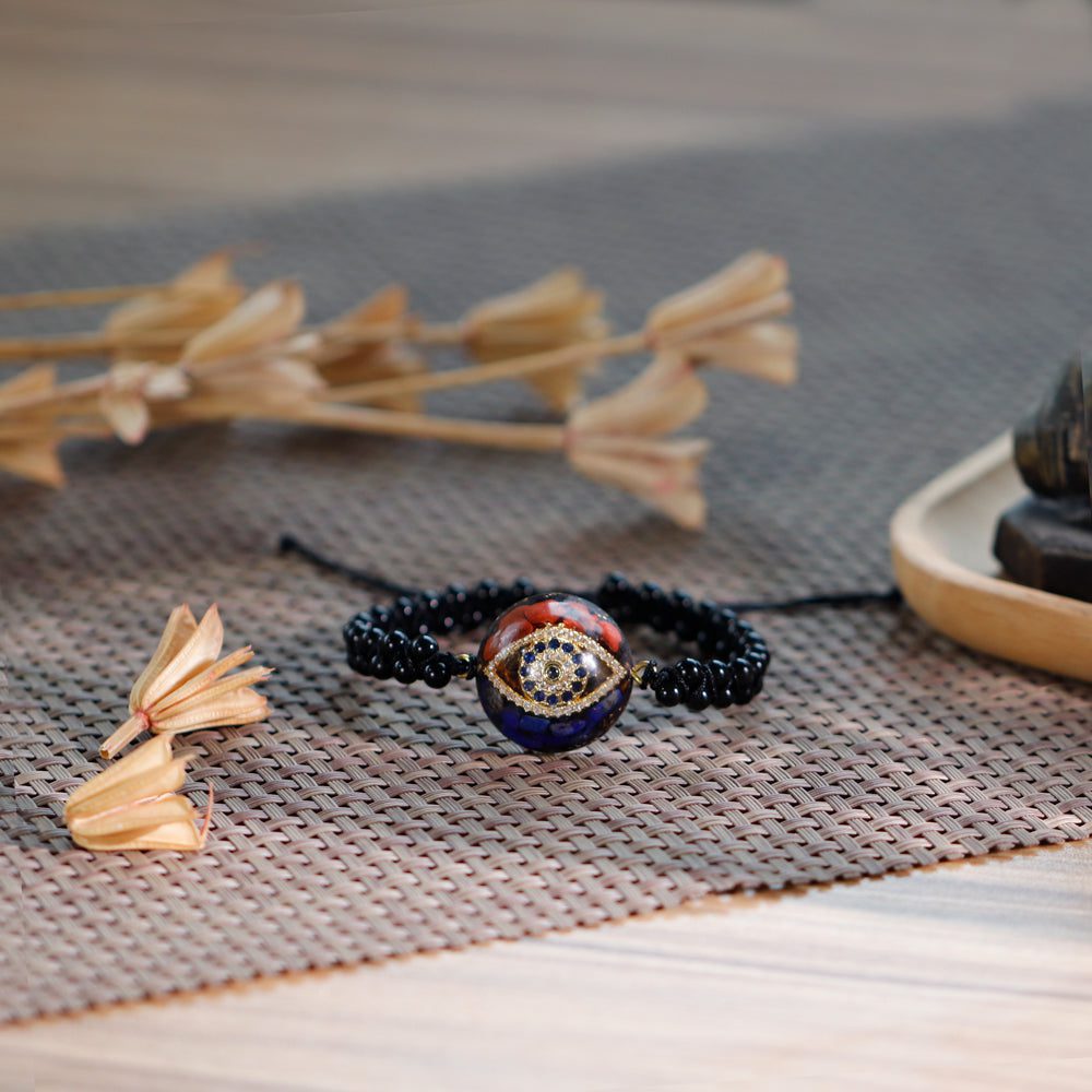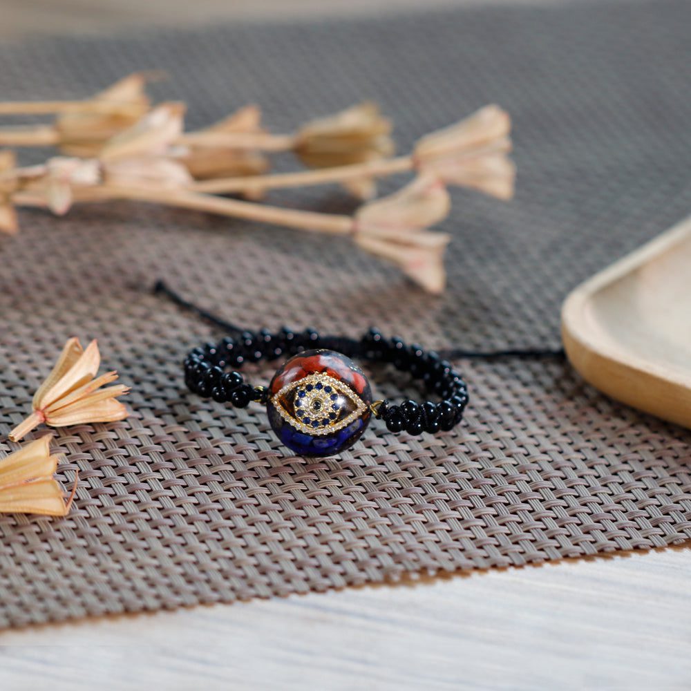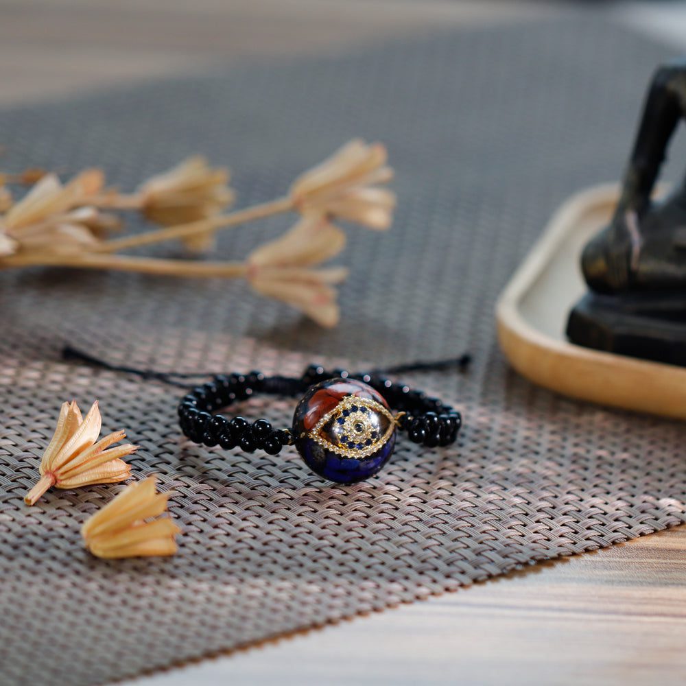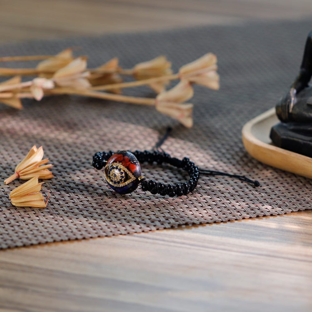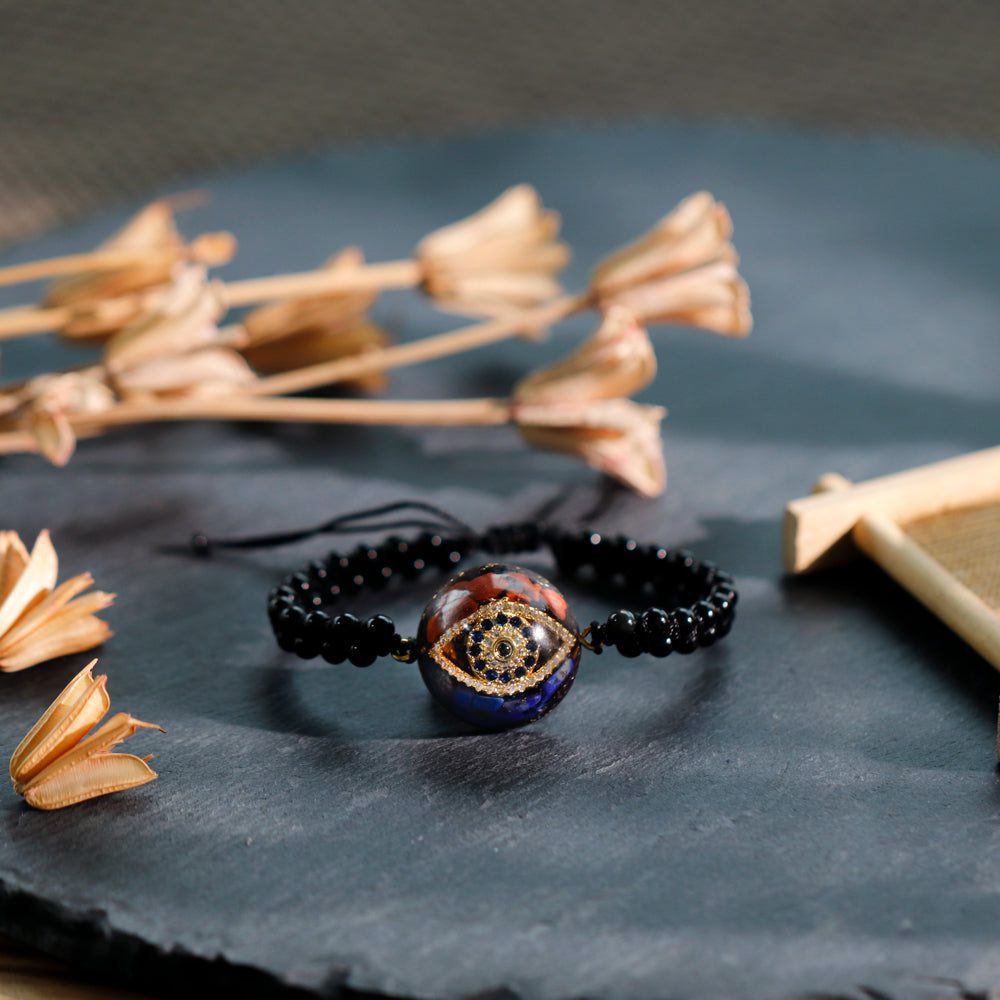 Harmonize your energy and protect yourself from negative influences with our captivating Evil Eye Orgone Bracelet. Meticulously crafted with a dynamic fusion of Lapis Lazuli, Redstone, Gold Foil, Copper, Black Agate Beads, Zircon, and Epoxy Resin, this bracelet is more than just an accessory - it's a powerful shield that promotes both well-being and style.