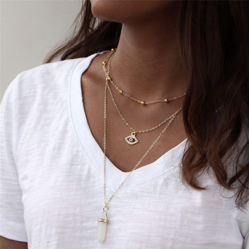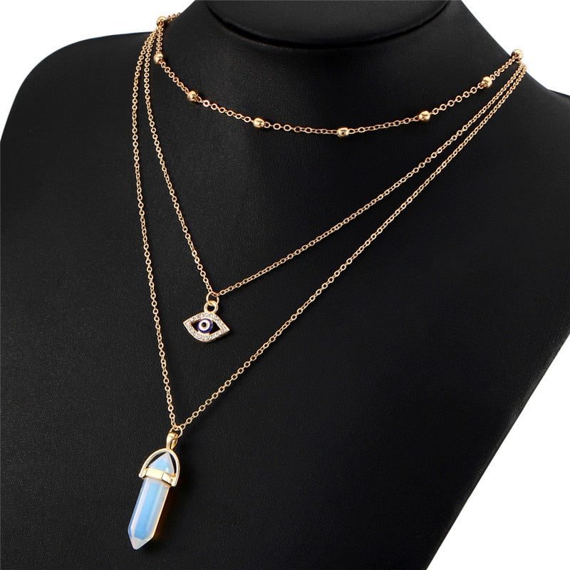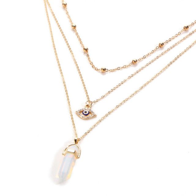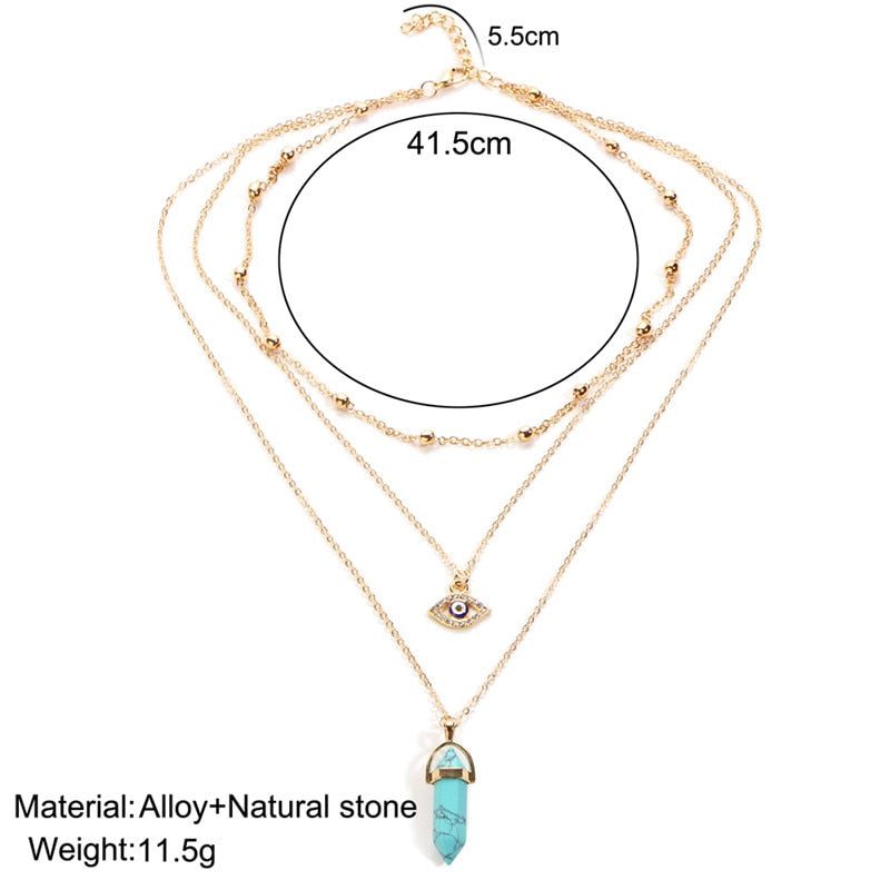 Channel your inner Boho chic with this vintage-style layered necklace. Featuring a lovely natural crystal bullet pendant in a beautiful layered combination with an Evil Eye necklace that makes it so captivating. This necklace will transform your everyday look into a gypsy-inspired ensemble. Express your creativity and feel the energy of protection around you.