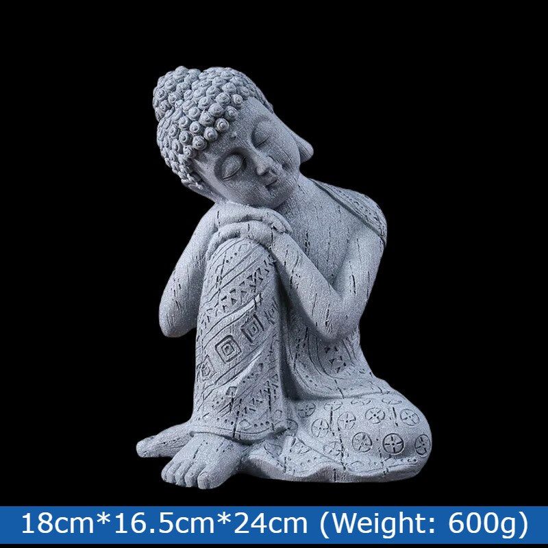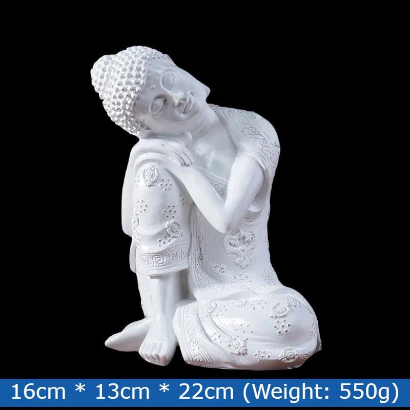 Take a look at this: Buddha's hands and head are resting on one knee, which is drawn up against his chin, and his eyes are closed. This pose exudes total relaxation and tranquillity, and it represents the restfulness and calm that can be attained through meditation practice. The peaceful expression on the face beautifully captures the moment's pure stillness.