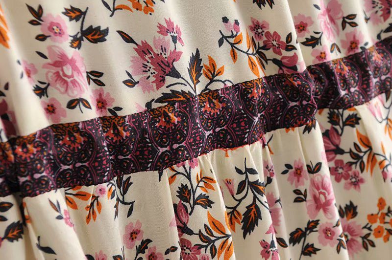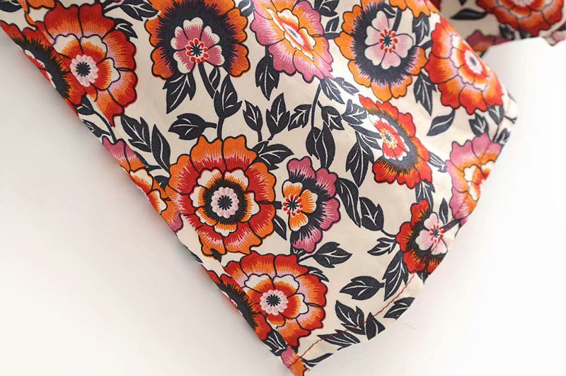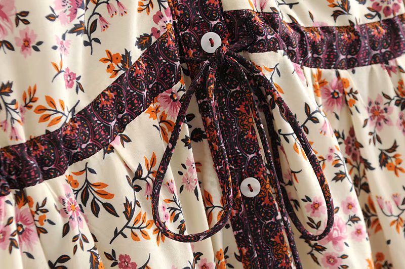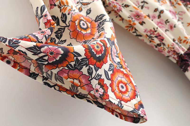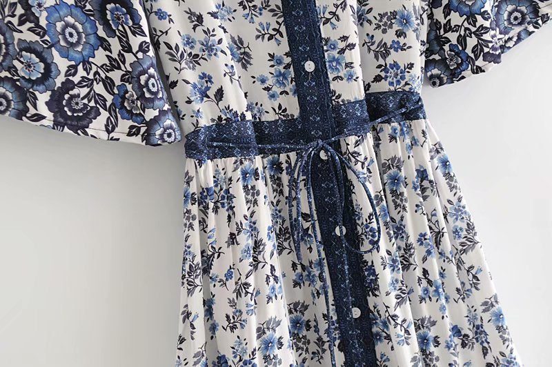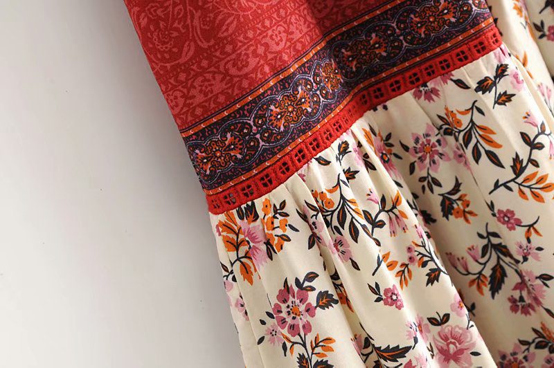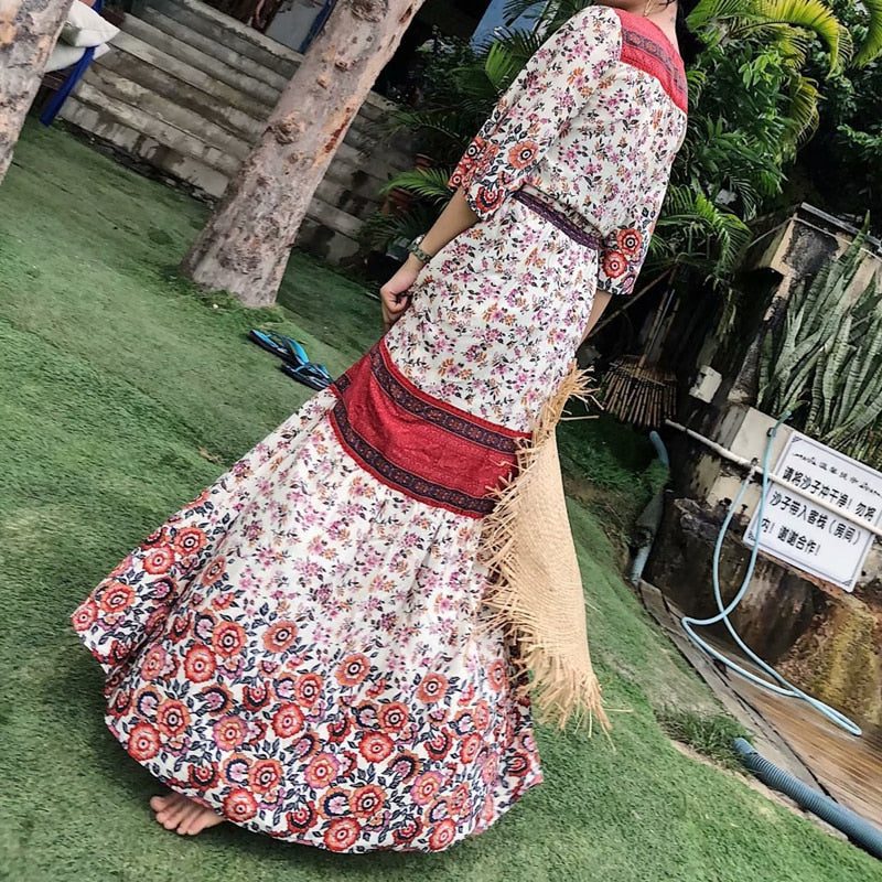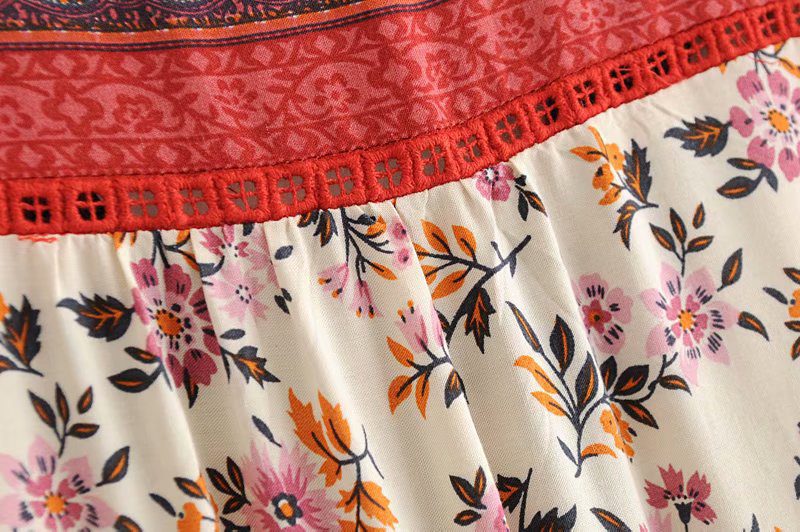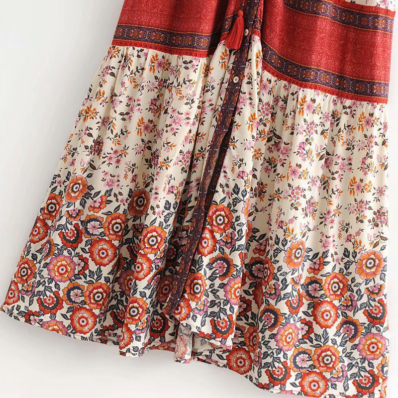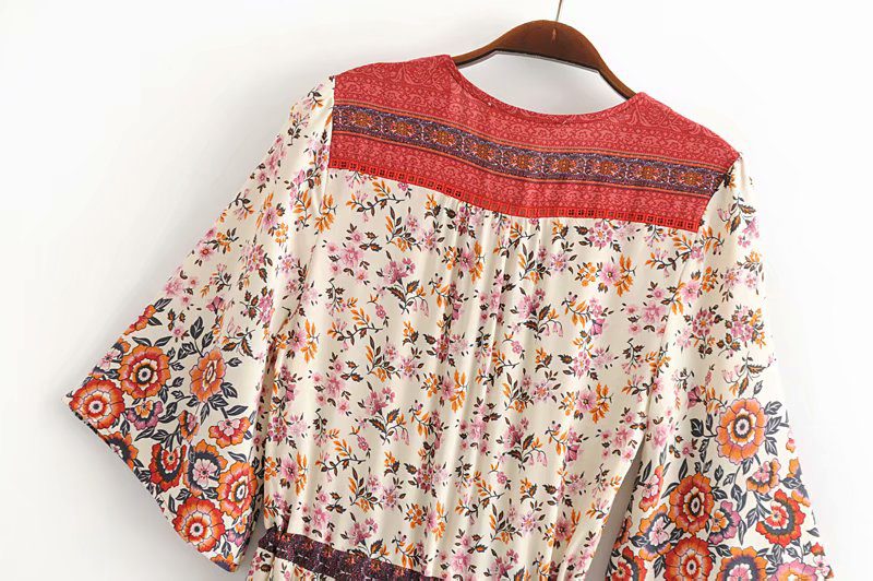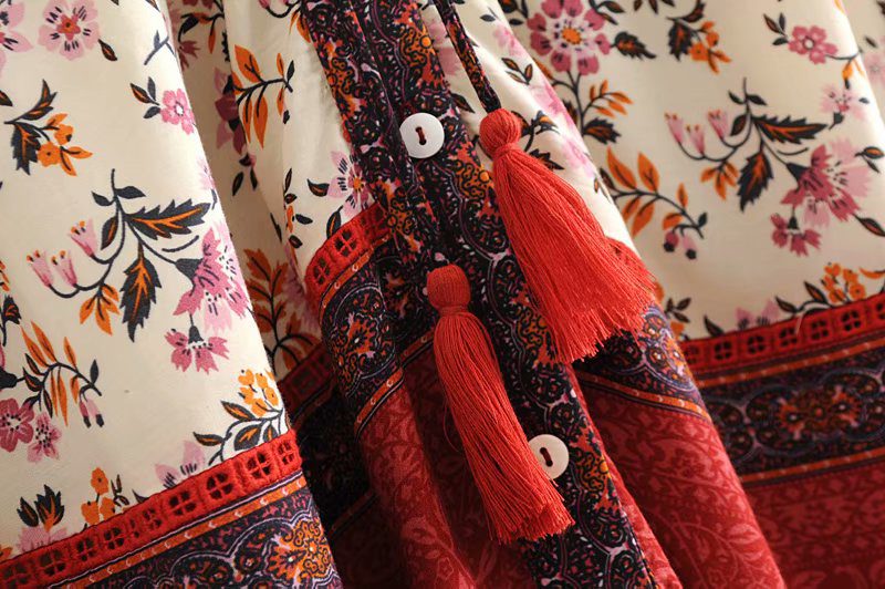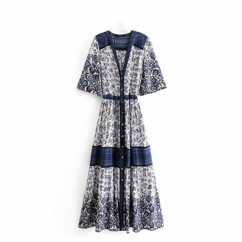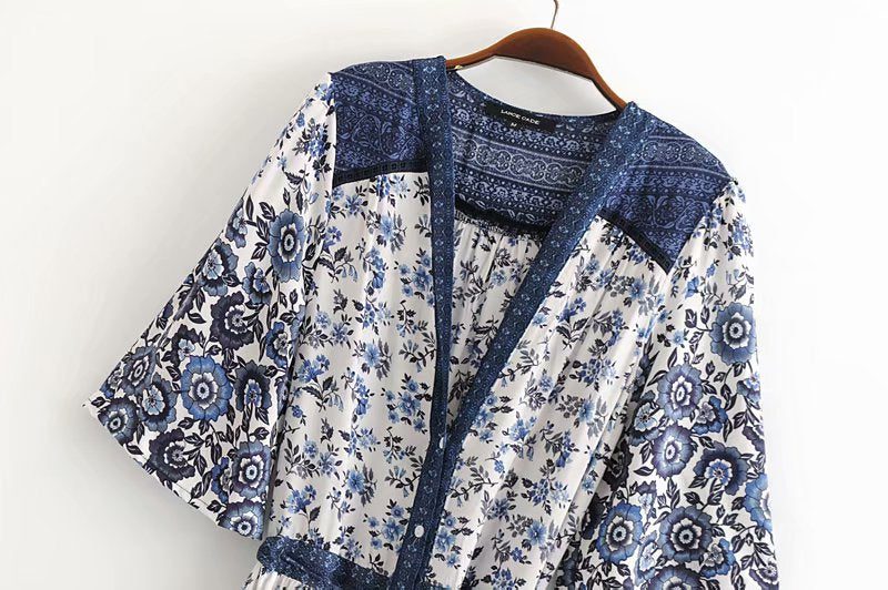 Flowing effortlessly in a relaxed fit, this boho dress boasts a retro floral print in blue or red base. Designed with a V neckline, bat wing sleeves, and button down closures. This