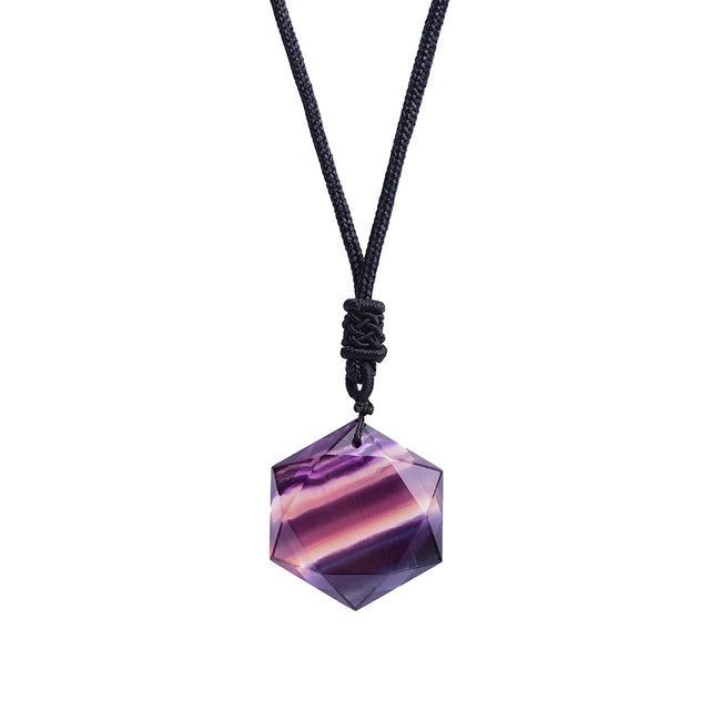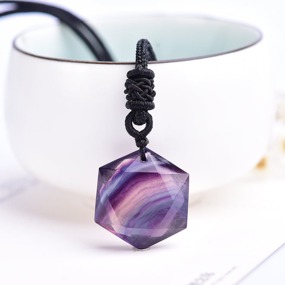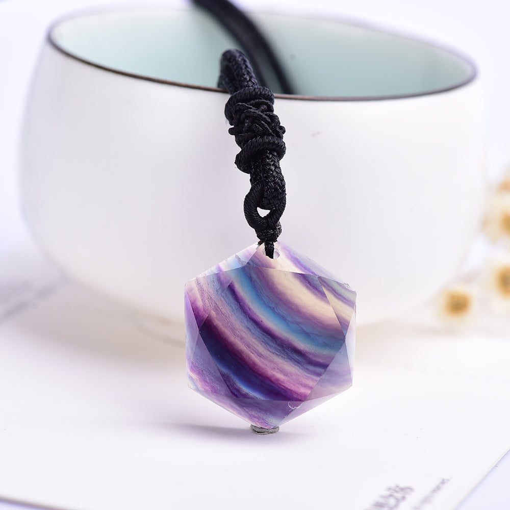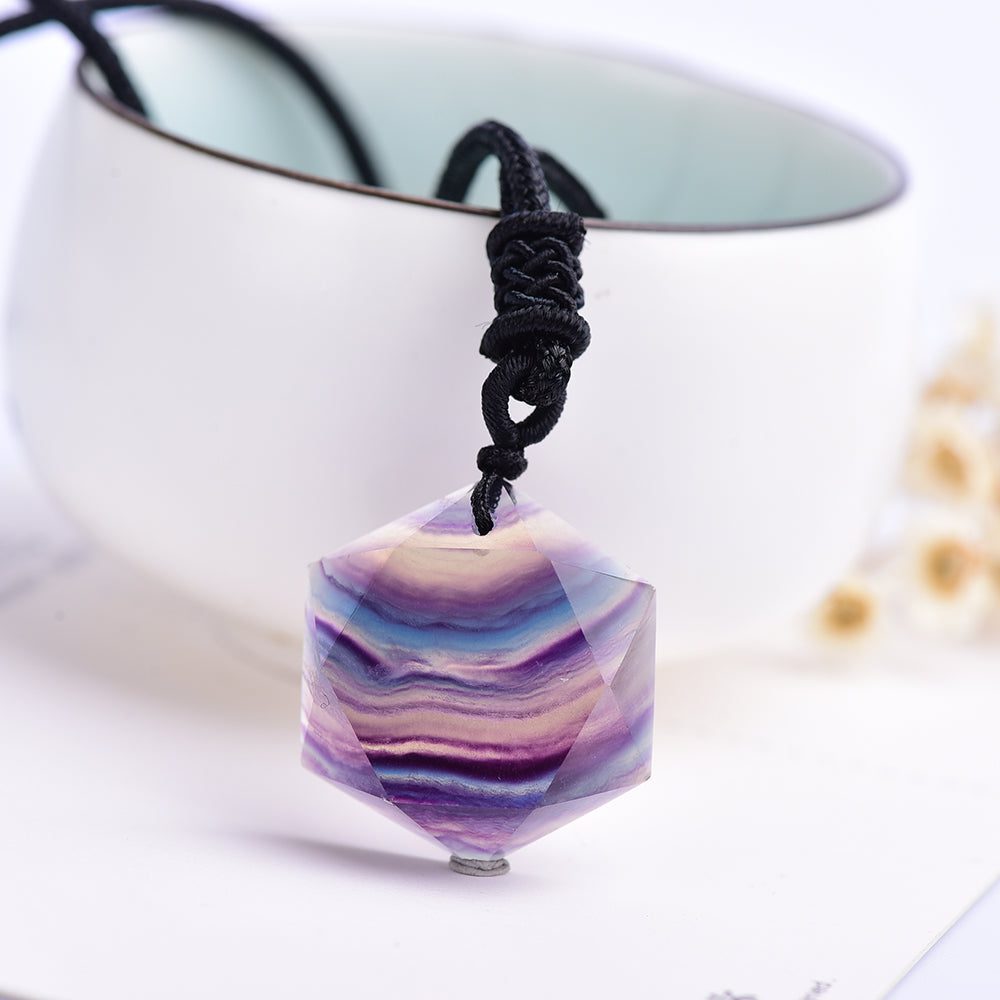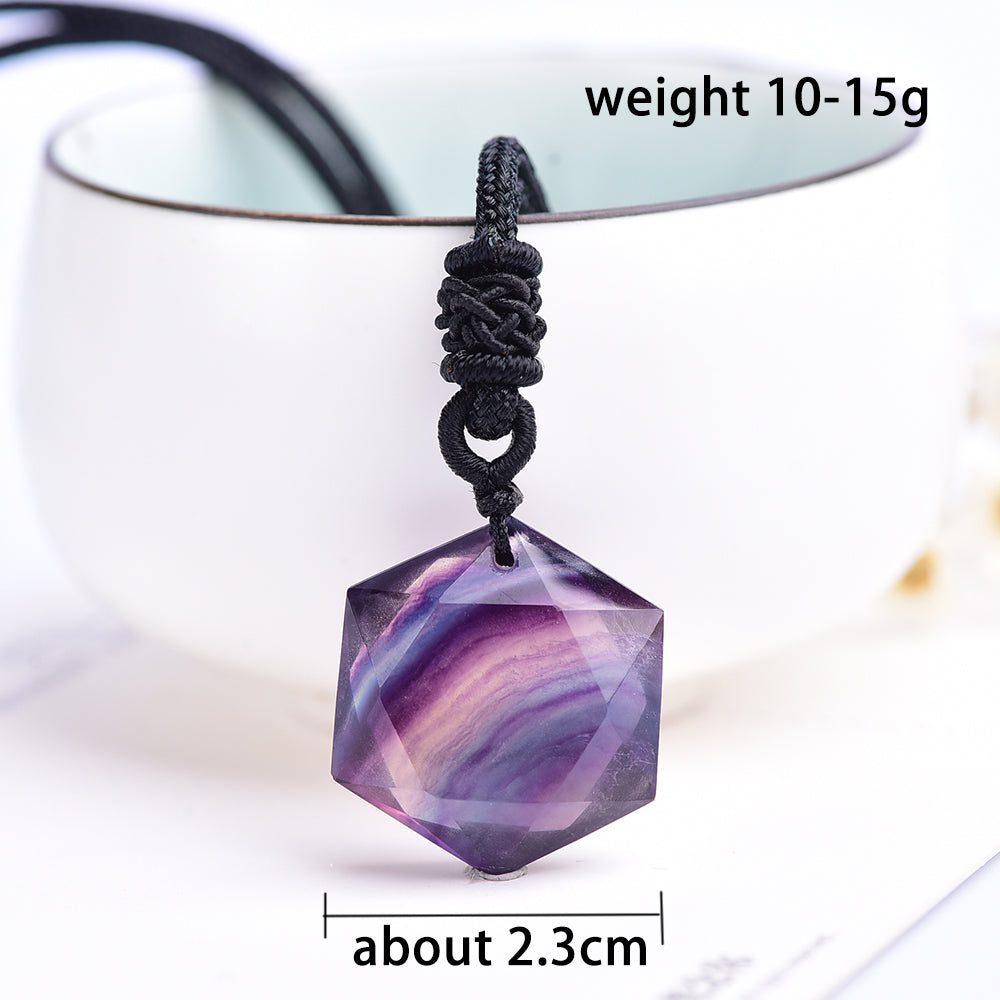 Measuring approximately 25mm in size, the Fluorite Pentagon pendant exudes a symmetrical elegance that captures the eye and stirs the soul. Its intricate patterns and dazzling colors reflect the diversity and unity found within the natural world.