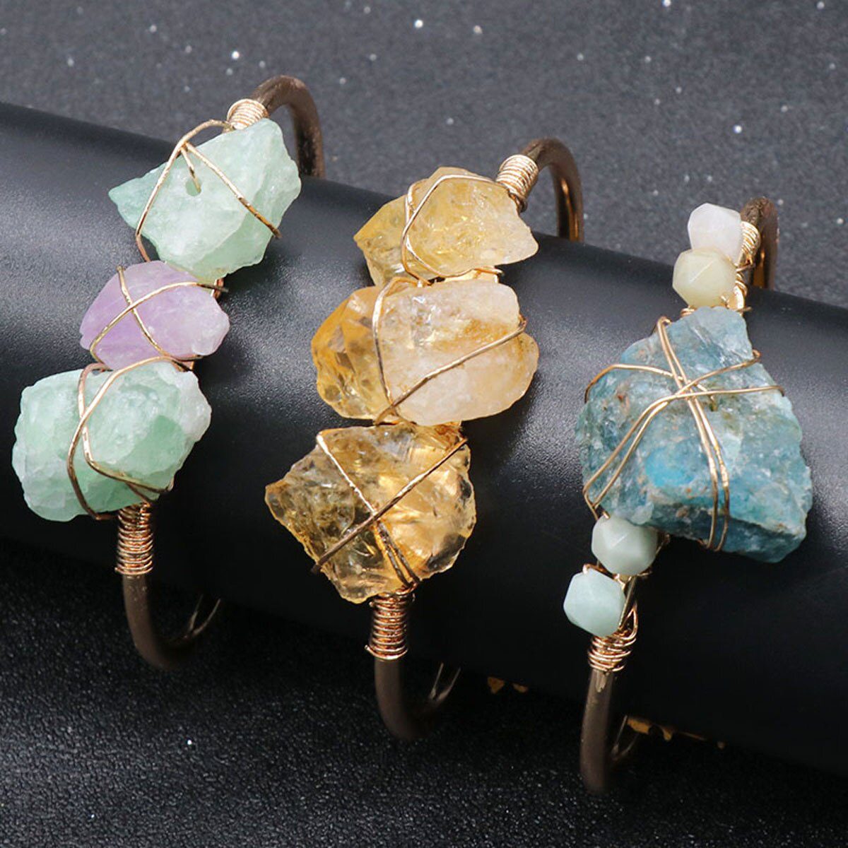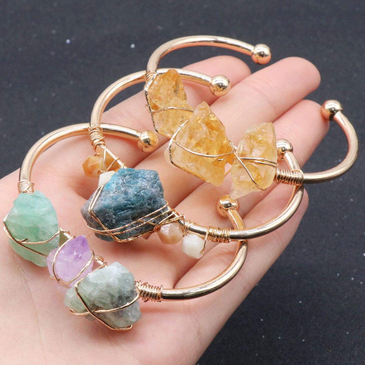 Crafted from a harmonious blend of natural stones, Citrine, Apatite, and Agate, these bangles resonate with the essence of growth, clarity, and balance. The vivid hues of Citrine inspire optimism and creativity, Apatite's serene energy fosters communication and insight, while Agate offers stability and harmony.