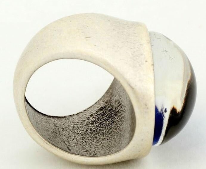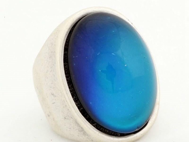 The ring contains thermotropic liquid crystals inside the stone. These liquid crystals are able to show different colors at different temperatures so as your body reacts to your mood, your emotional state will be revealed by the corresponding colors of the ring.