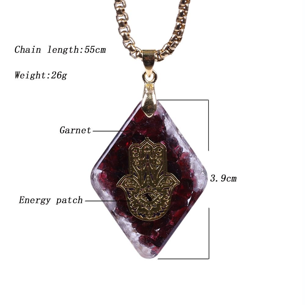 This Garnet Hand Of Hamsa Orgone Necklace is a great tool to enhance your spiritual growth, improve your meditation, and harness the positive benefits of Natural Garnet stone. Wearing this is a great way to continually feel the positive effects of orgonite since it is steadily in contact with your body. Your energy will be regularly refined and brought back to its original and balanced state.