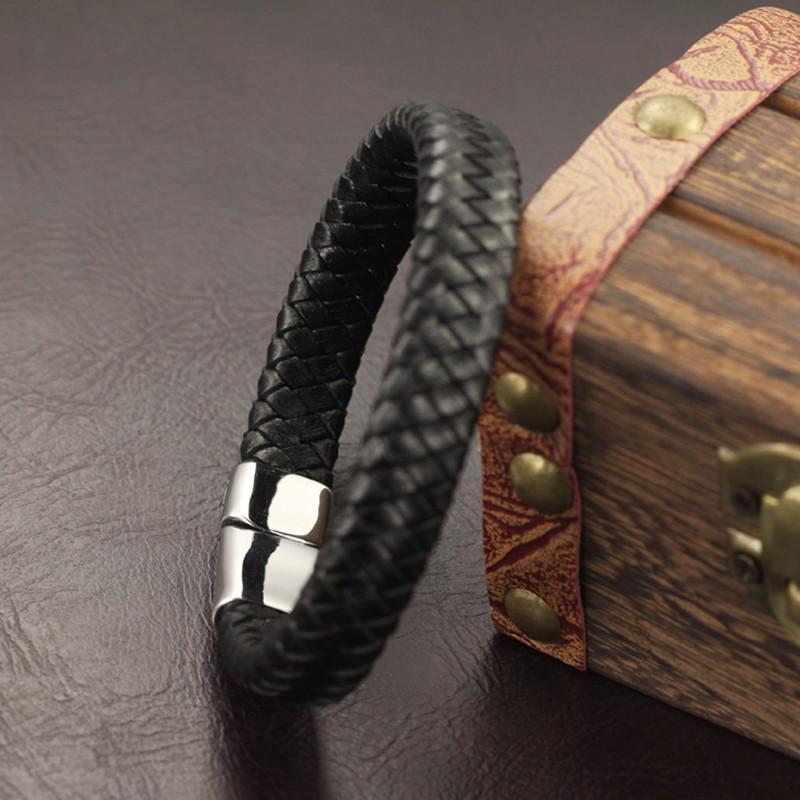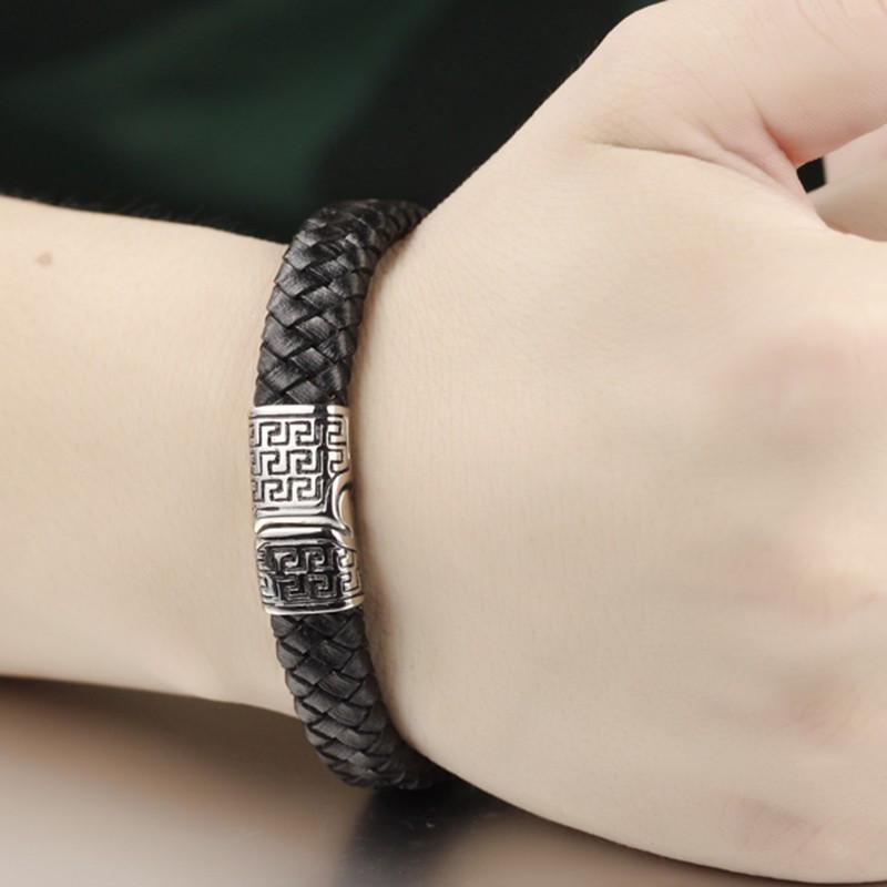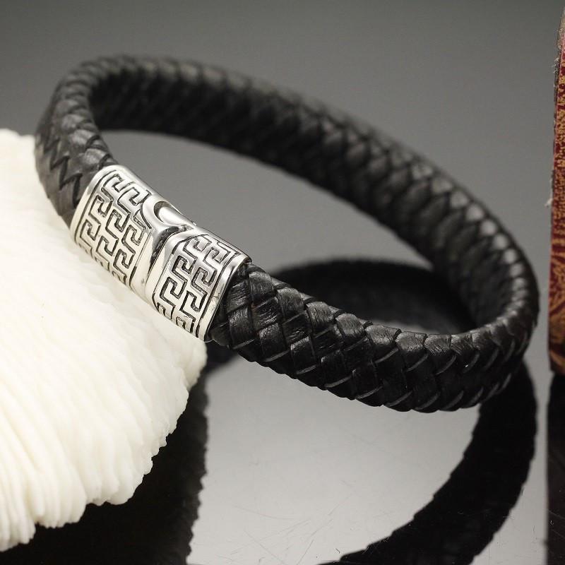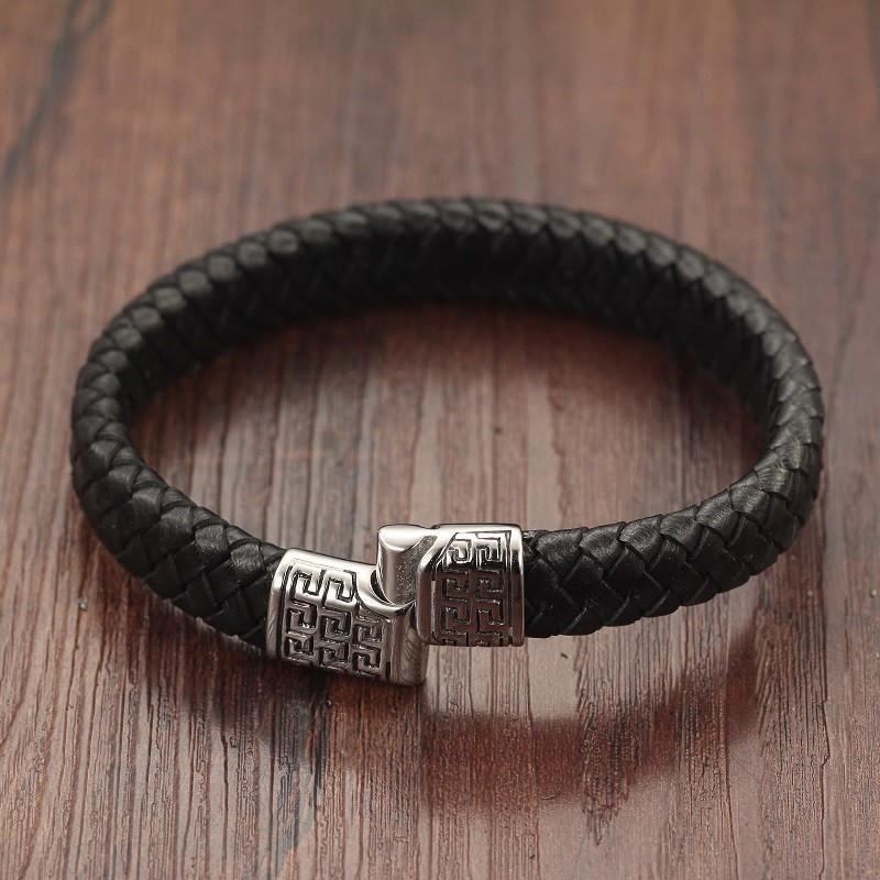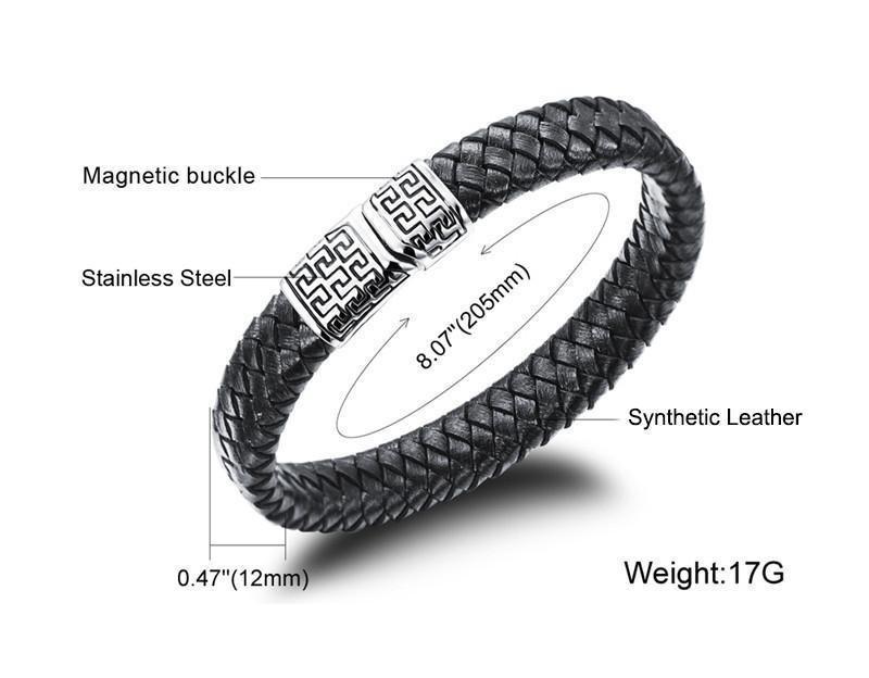 unique combination of a multi-strand braided leather paired with a stainless steel magnetic clasp engraved with a nice, clean, geometric tribal design tinted with black tones to bring out the detail.