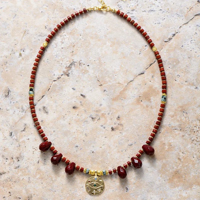 The rich red stones are accented with a selection of complementary Mostacilla beads,culminating in a stunning gold Egyptian eye pendant – a symbol of protection and power.