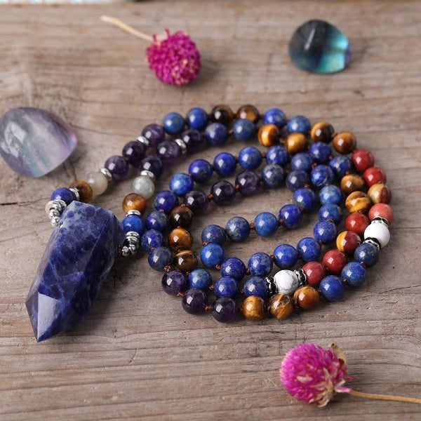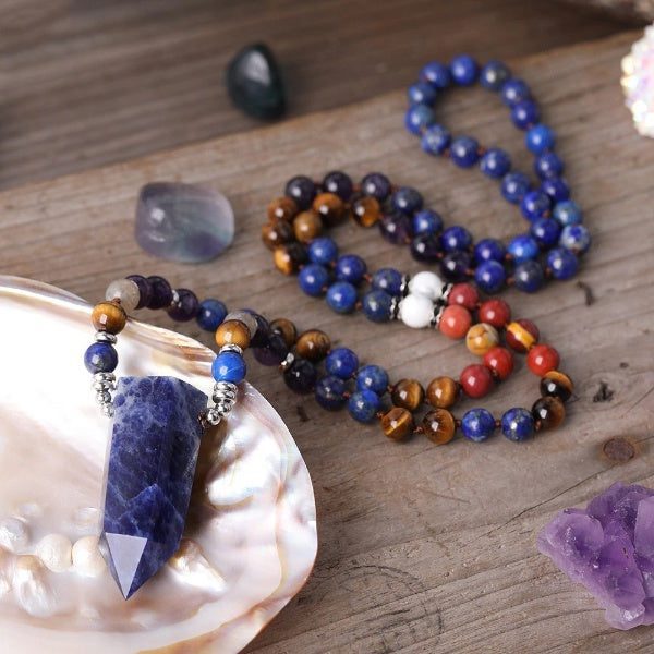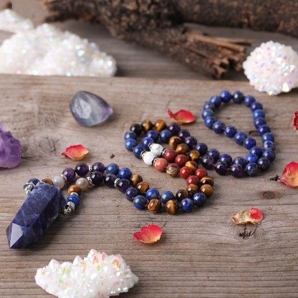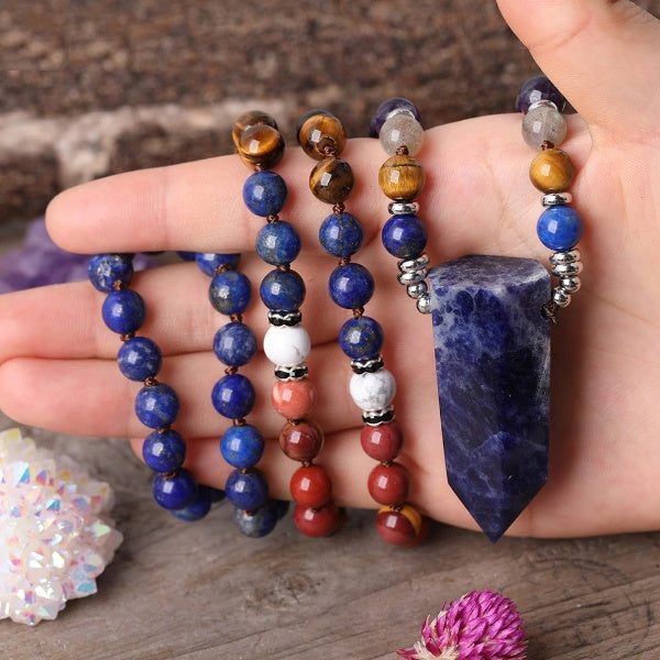 Material/stones:Natural sodalite, amethyst, quartz, tiger eye, and lapis lazuli crystals