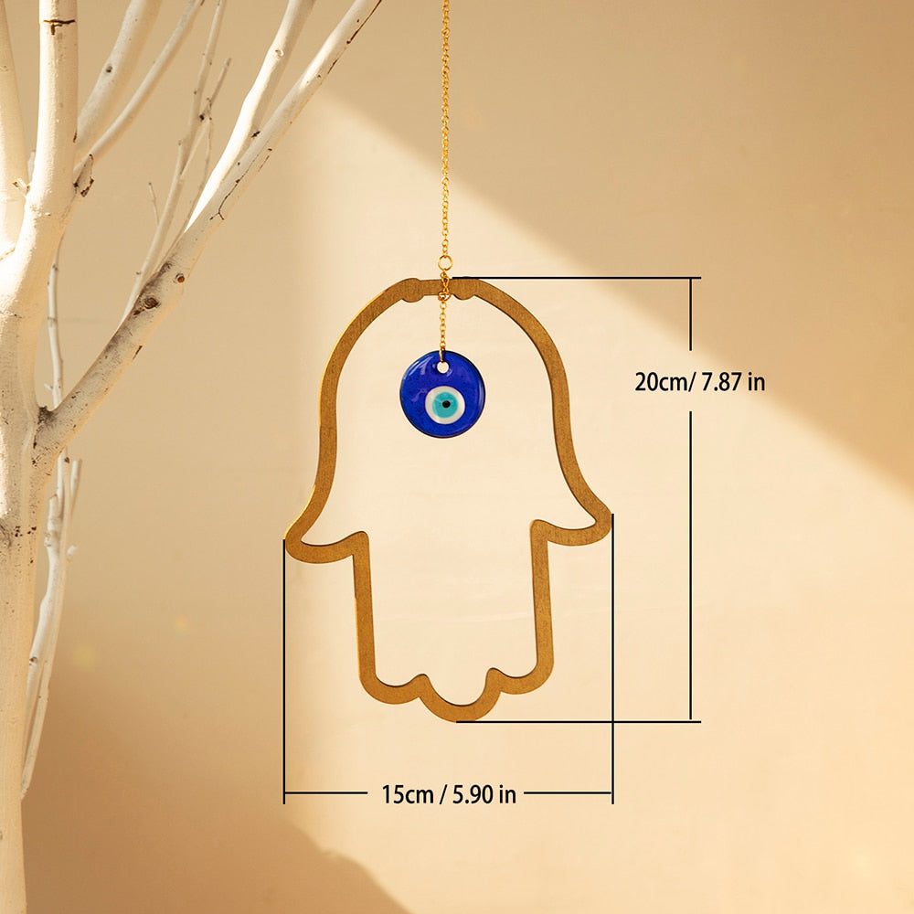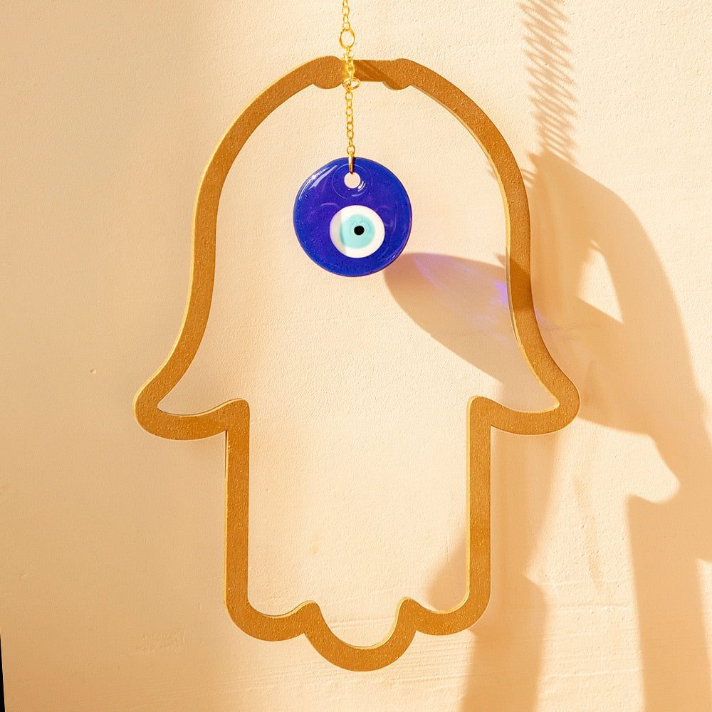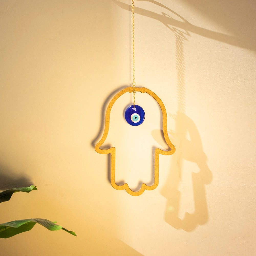 This wall hanging depicts a hamsa hand pointing downward. It is a gesture of welcoming an abundance of goodness, kindness, friendship, and grace into your life. To further enhance and deliver luck, the fingers are frequently fused together.