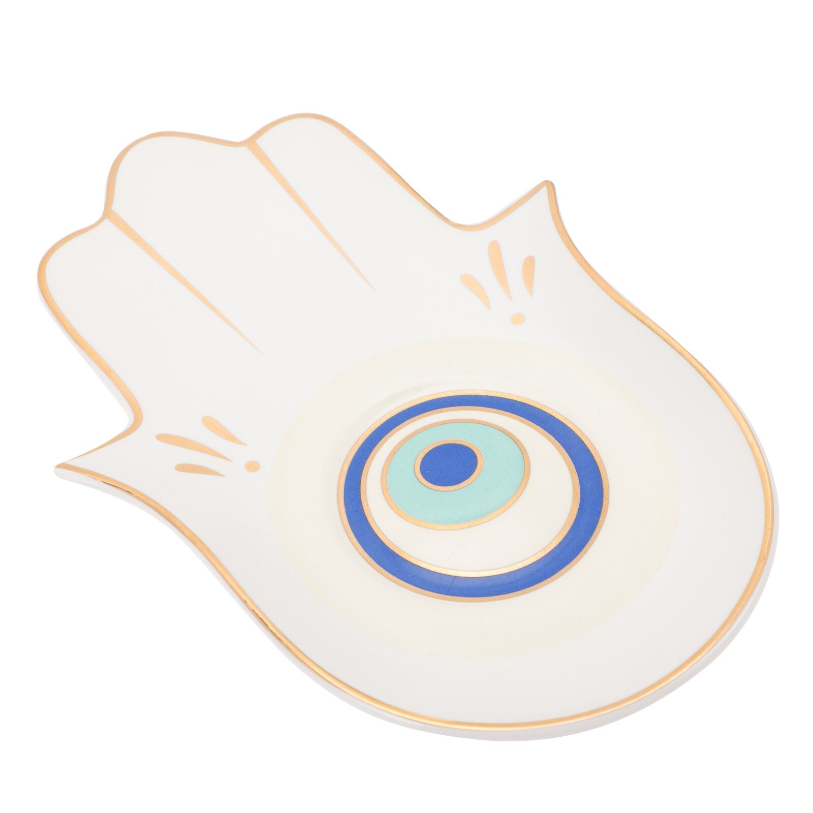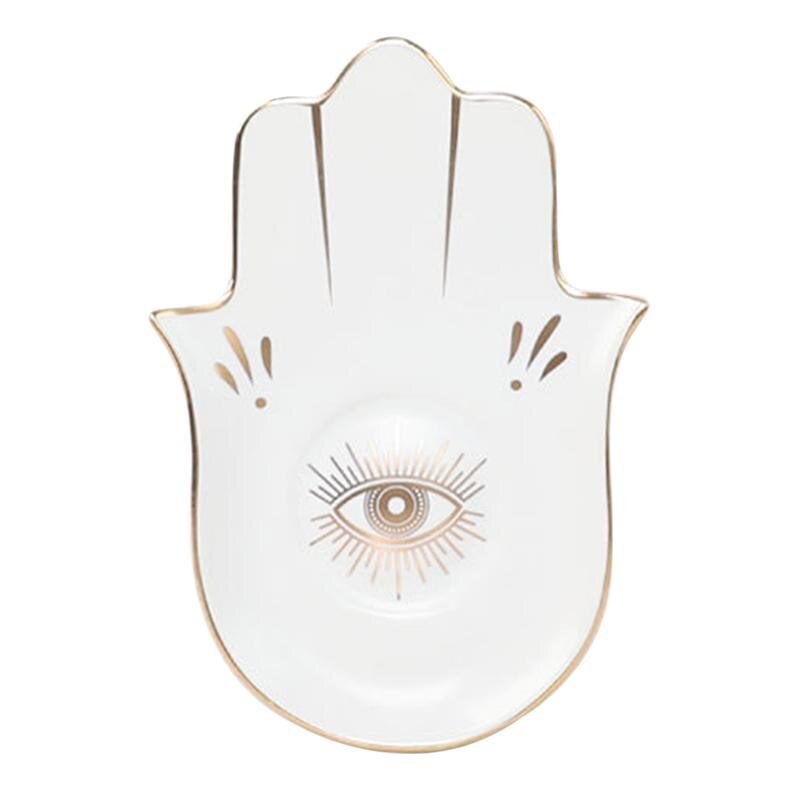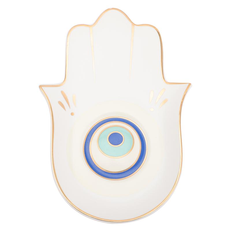 Elevate your home decor with our Hamsa Hand Evil Eye Curio Plate, a beautifully designed ceramic piece that combines the protective symbolism of the Hamsa Hand with the traditional warding powers of the Evil Eye.