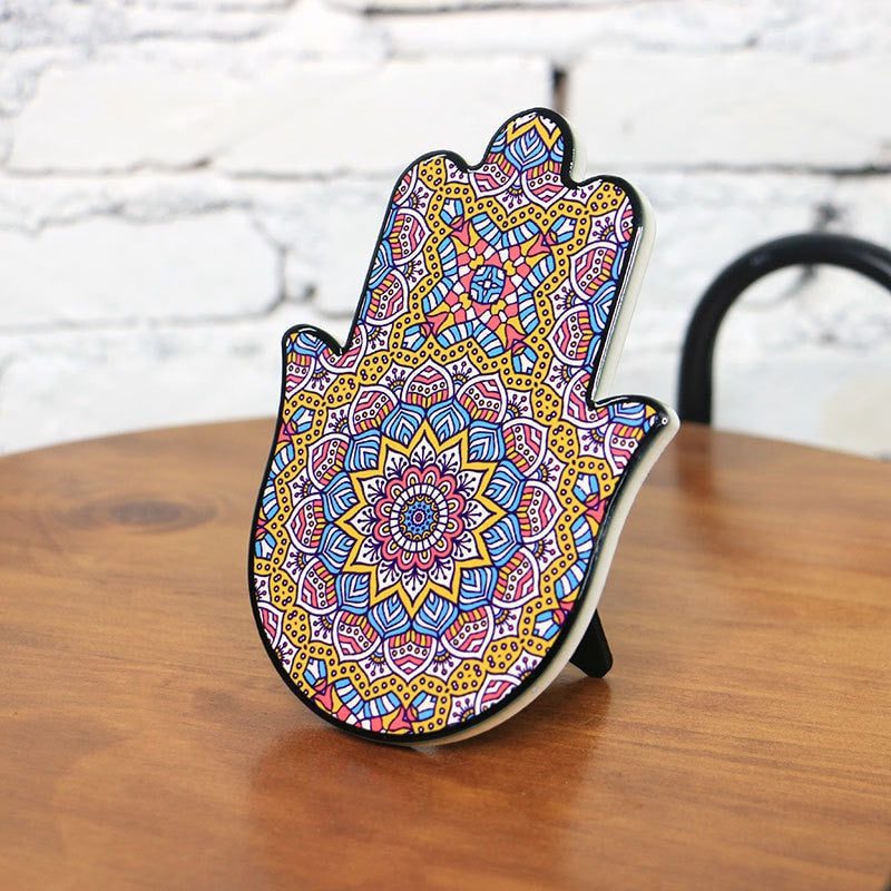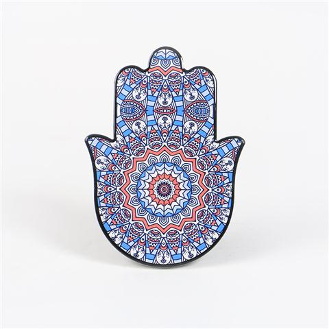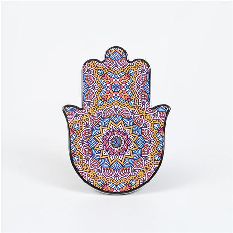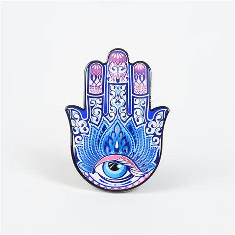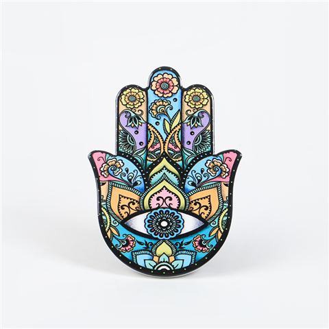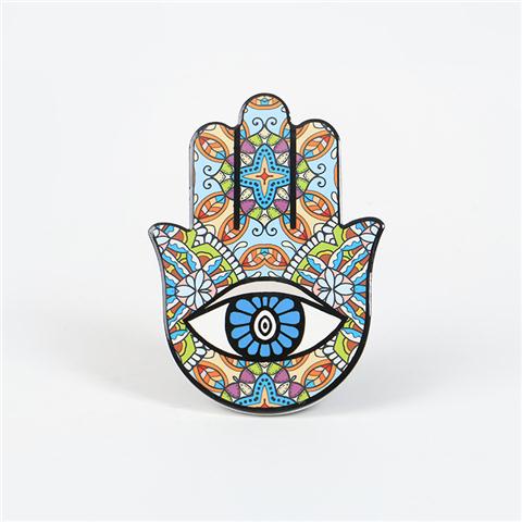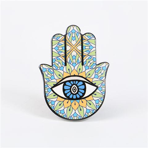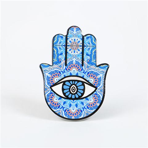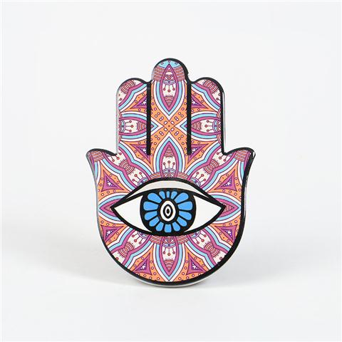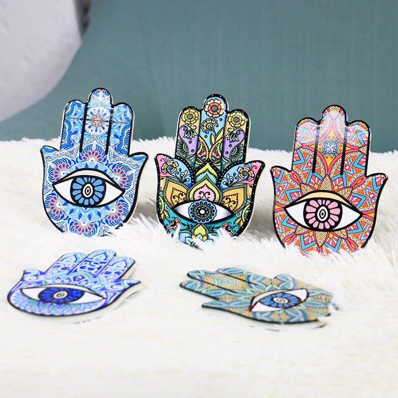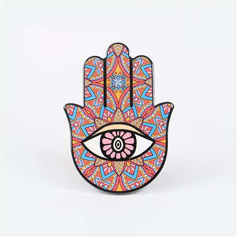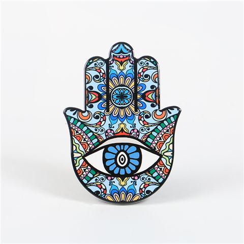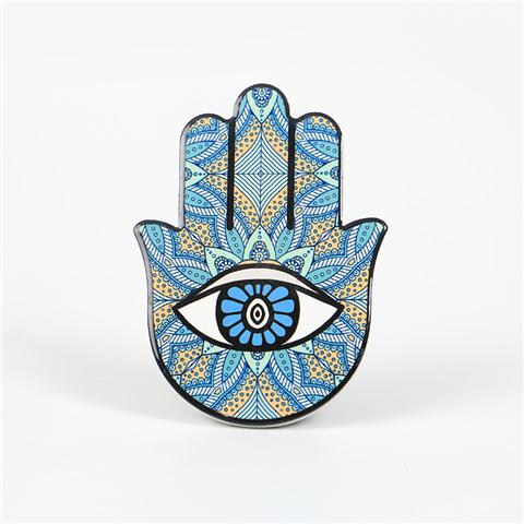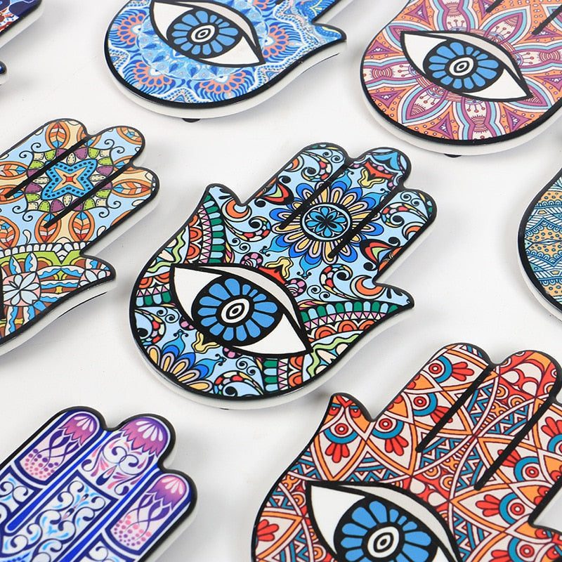 The Hand of Fatima is a powerful protective symbol. A symmetrical hand with fingers pressed close together and facing upwards is depicted. It also has a nazar boncugu eye in the center of the palm, which is said to repel the evil eye.