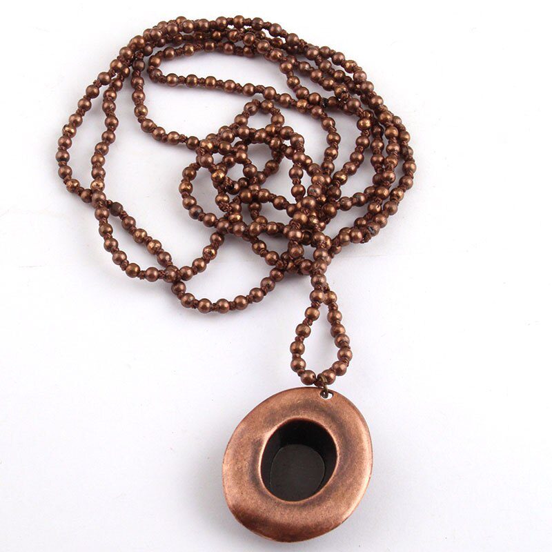 The length of the 4mm bronze plated beads lace is 57inches. which is below any neckline but above the bust line. The hat measures approximately 2.7 inches in circumference. Overall, the necklace is made of zinc alloy, which is lightweight and durable, making it ideal for everyday use. Finally, it will outlast traditional silver or gold jewelry by not tarnishing over time.