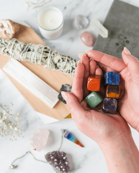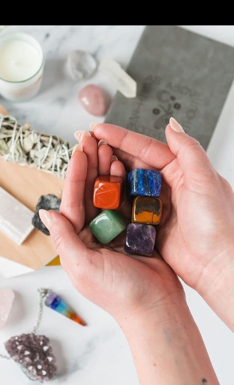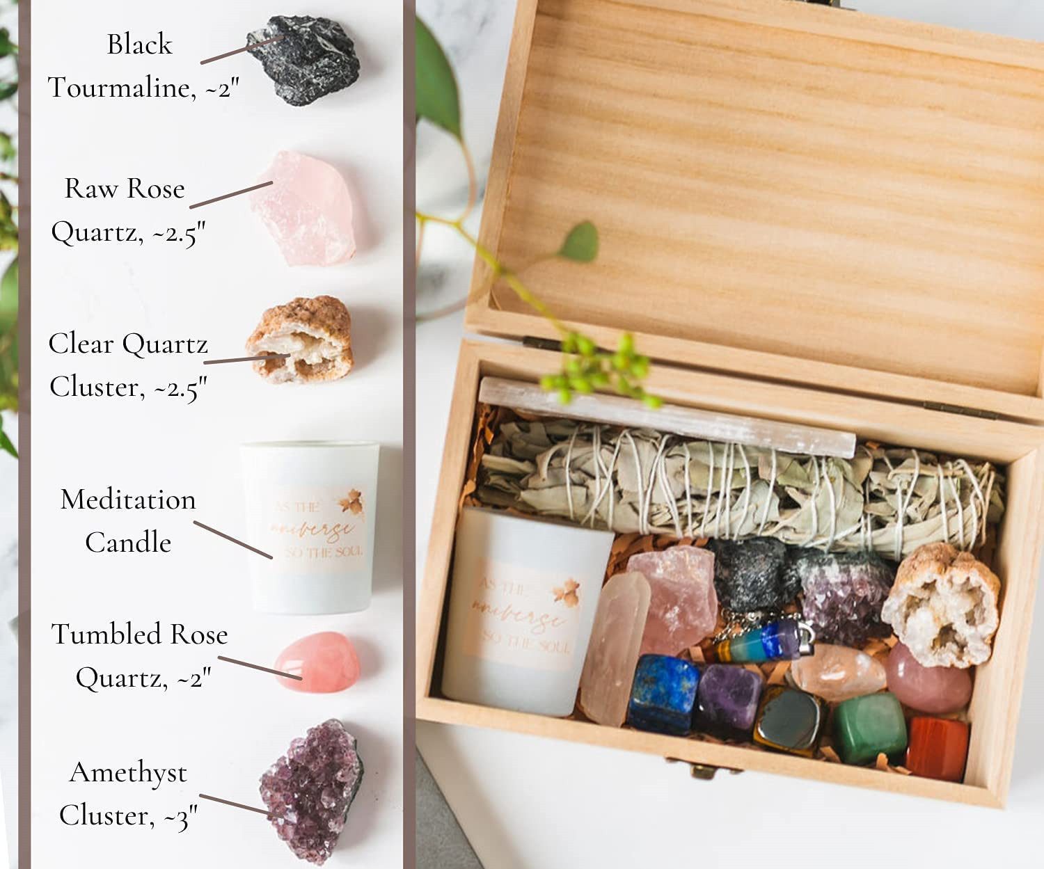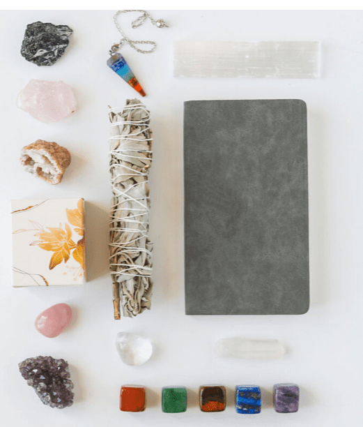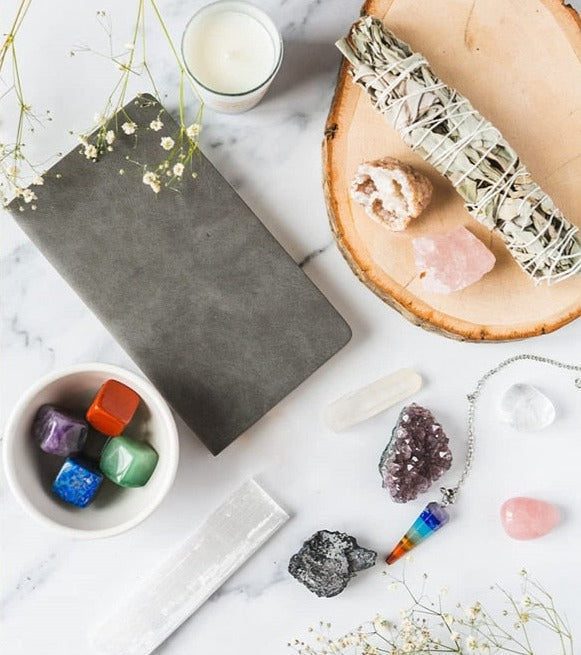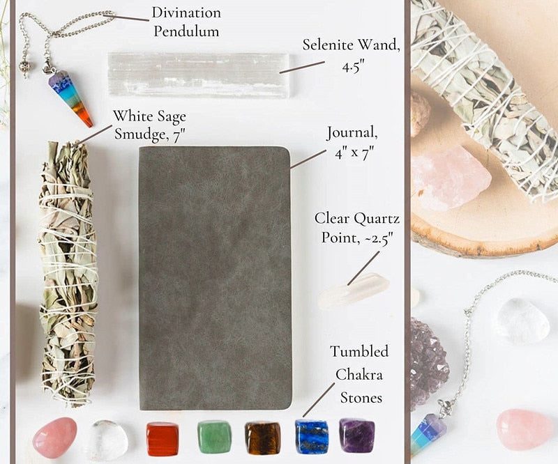 Materials:7 Chakra Stones, Crystal Cluster, Selenite Wand, Chakra Pendulum, Meditation Candle, Journal