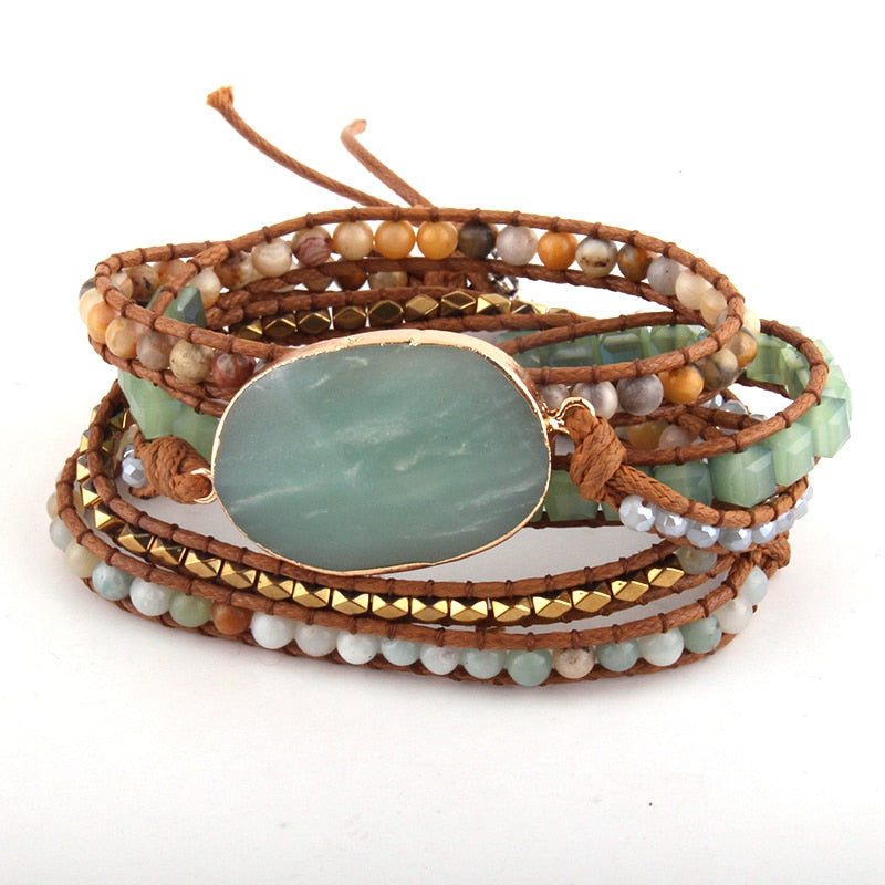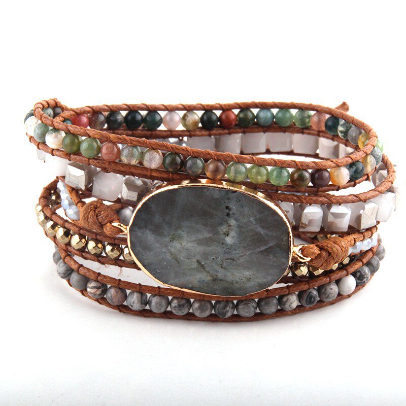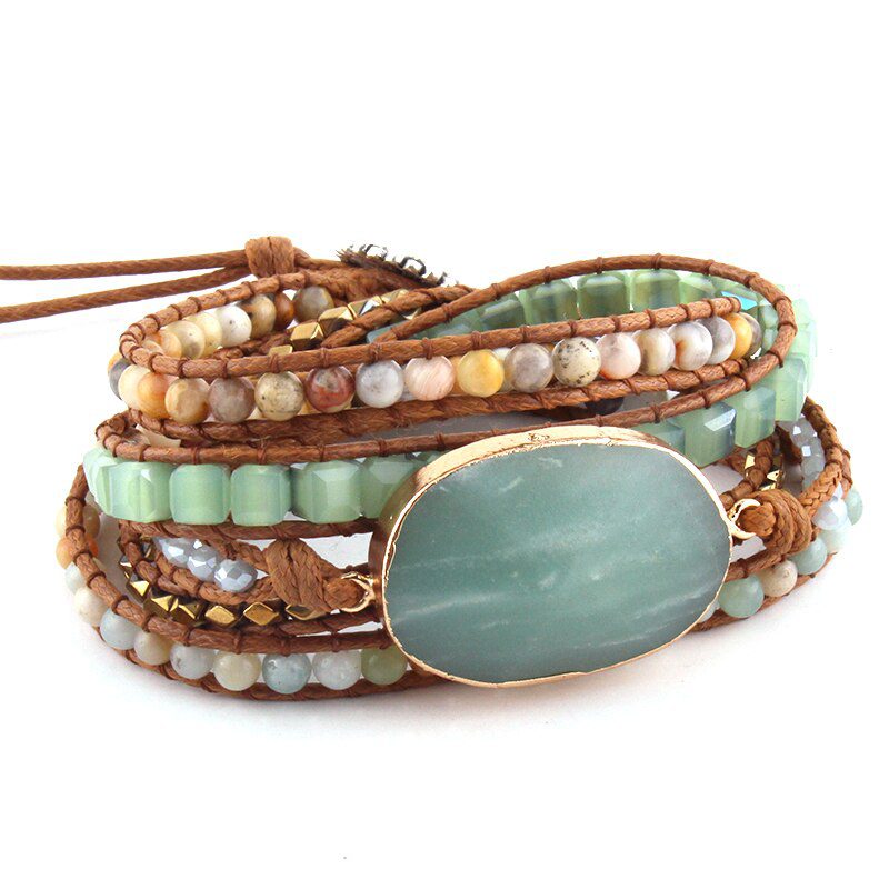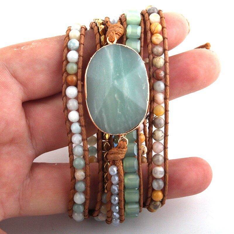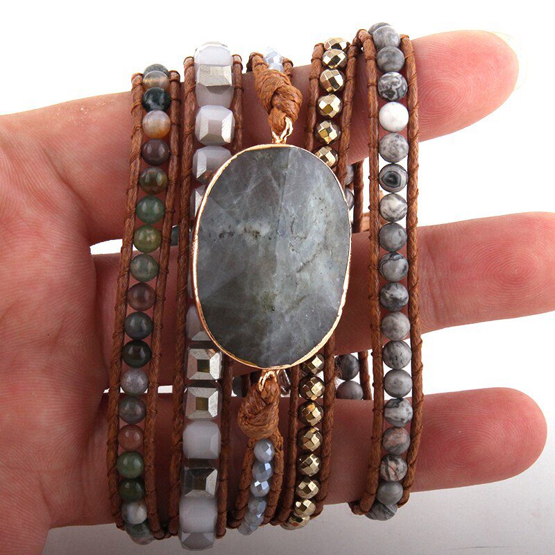 These bracelets are made of Korean wax thread, which has consistent thickness, color, and texture and won't fade easily. The rope is lightly waxed, manageable, but sufficiently stiff to tie knots or keep its shape. These wrap bracelets are 35.4 inches long overall and can also be worn as necklaces. The main stone measures approximately 0.90"*0.86" and the size of the beads is 4mm.