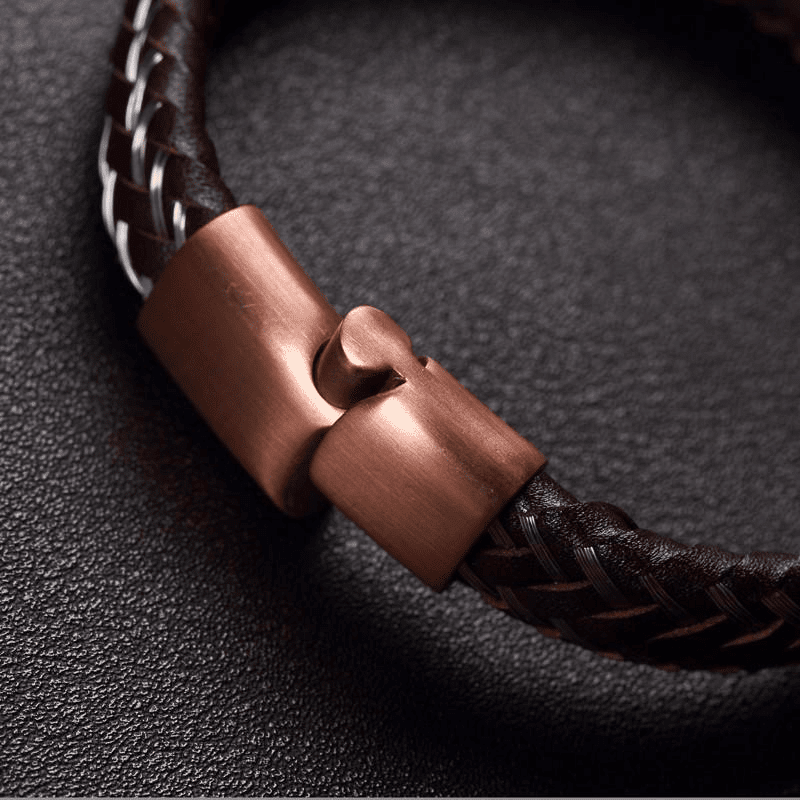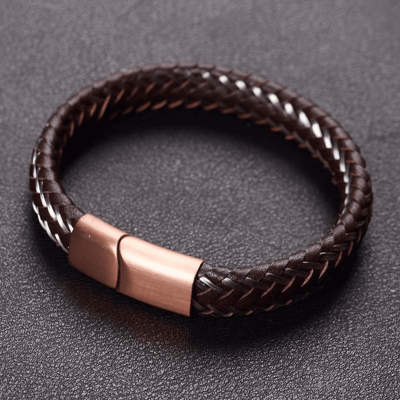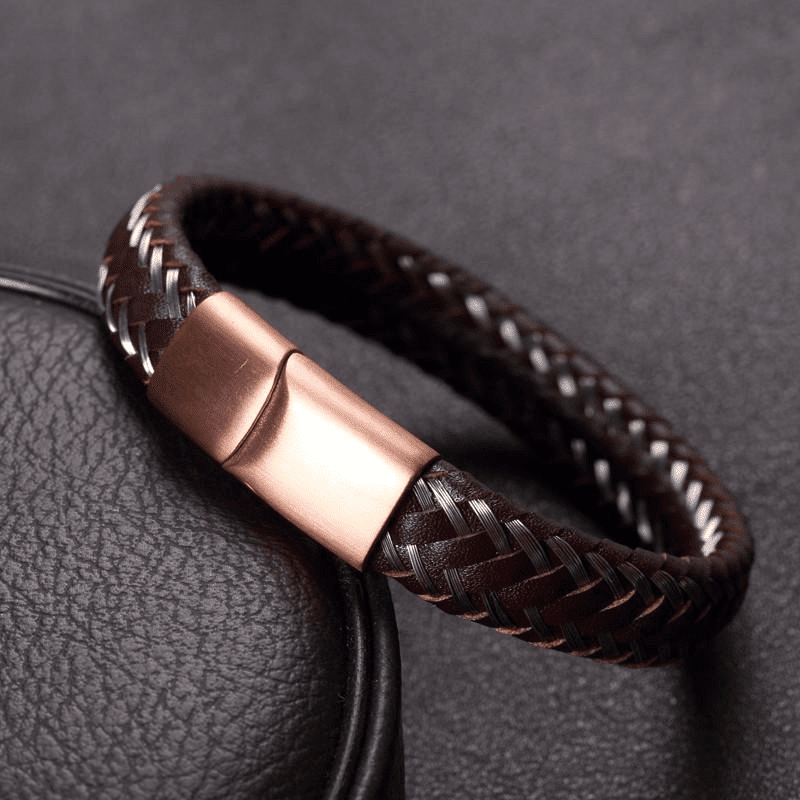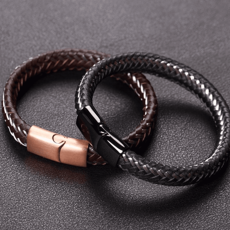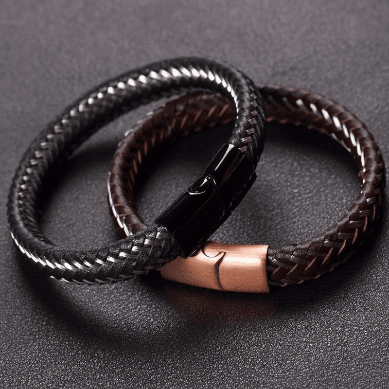 The black bracelet is paired with a black clasp with a high polished finish for that special shine. The brown bracelet is matched with a bronze toned brushed metal clasp for a beautiful classic style. A unique twist of sophistication to your rugged style.