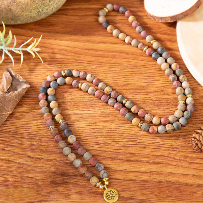 This mala has a length of 36.61 inches and can be worn as a necklace or bracelet. With a 0.59in metal pendant size. The lotus flower, which represents spiritual growth and the ability to overcome obstacles on the path to enlightenment, is used to create this piece.