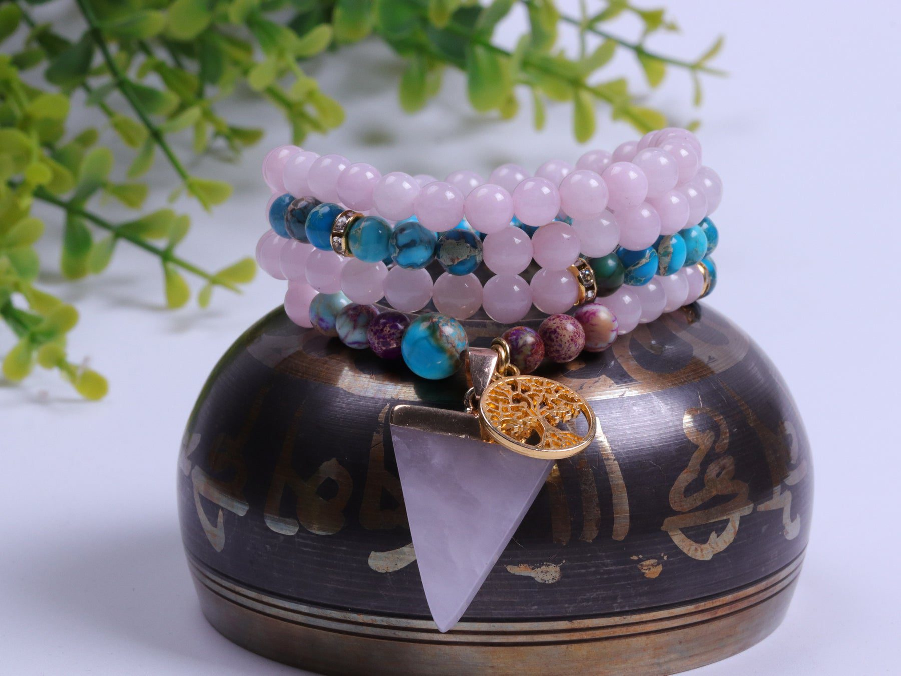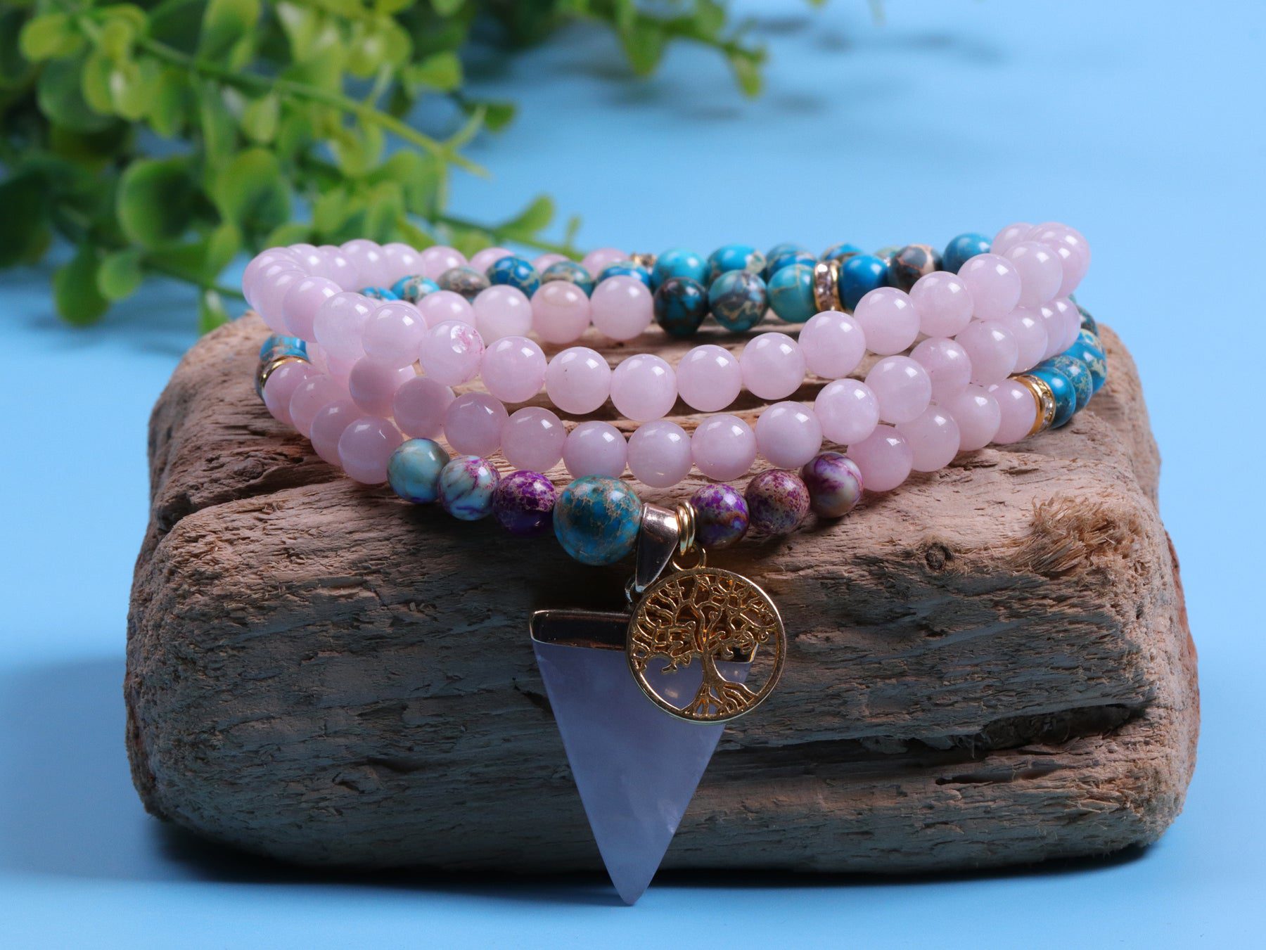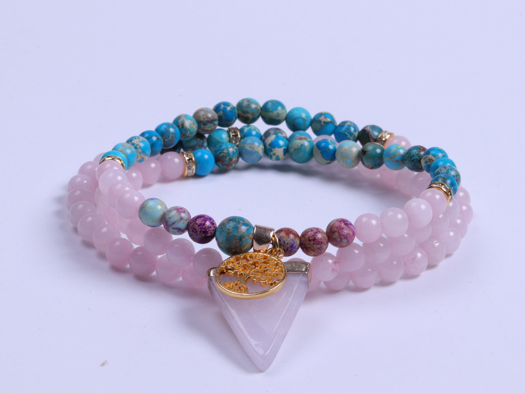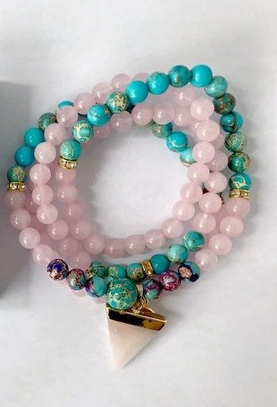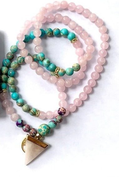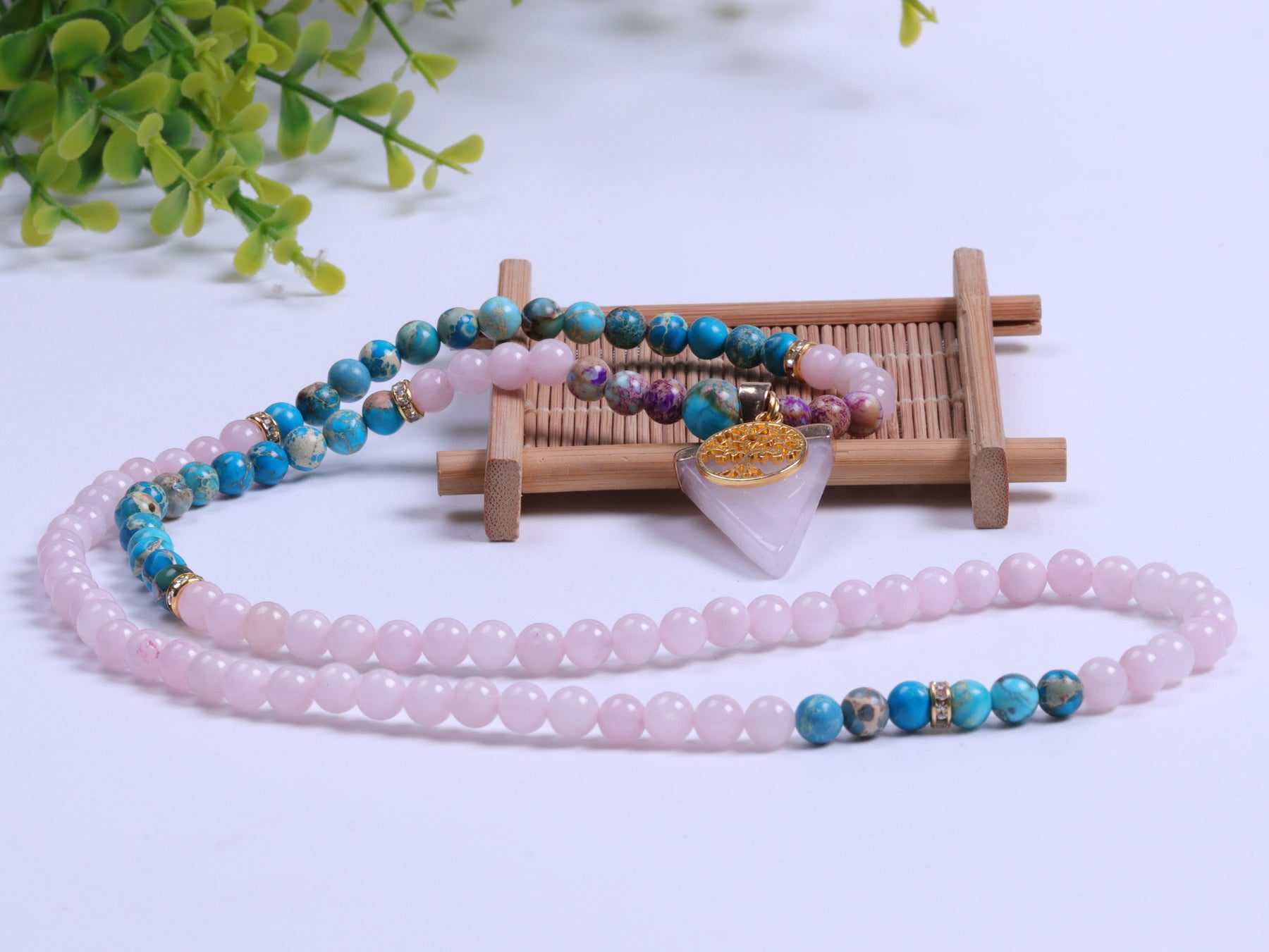 The pink pale color Rose Quartz beads and the dynamic Jasper pendant make a perfect combination.